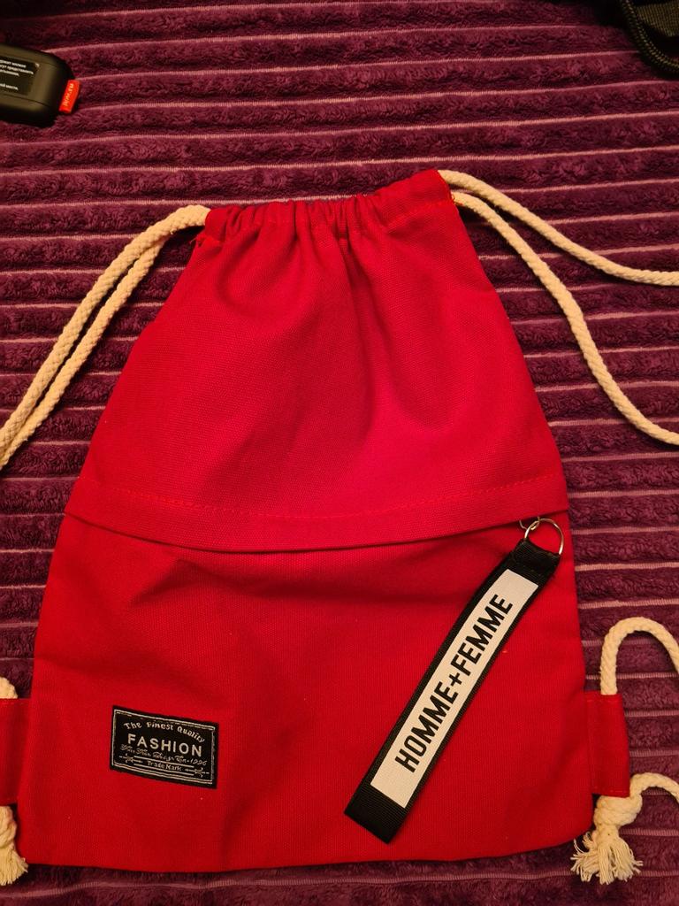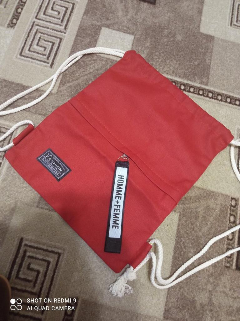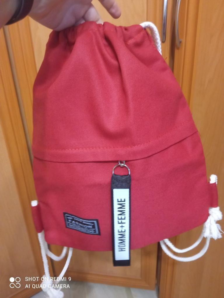 Рюкзак пришел в Украину прим. за 2 недели. Сам рюкзак из плотной ткани, похожей на мешковину. Стягивается и открывается очень тяжело. Есть 1 карманчик снаружи, молния работает хорошо. Цвет не ярко-красный, темнее чем на фото продавца. Местами есть торчащие нитки, на фото продавца рюкзак выглядел поинтереснее.