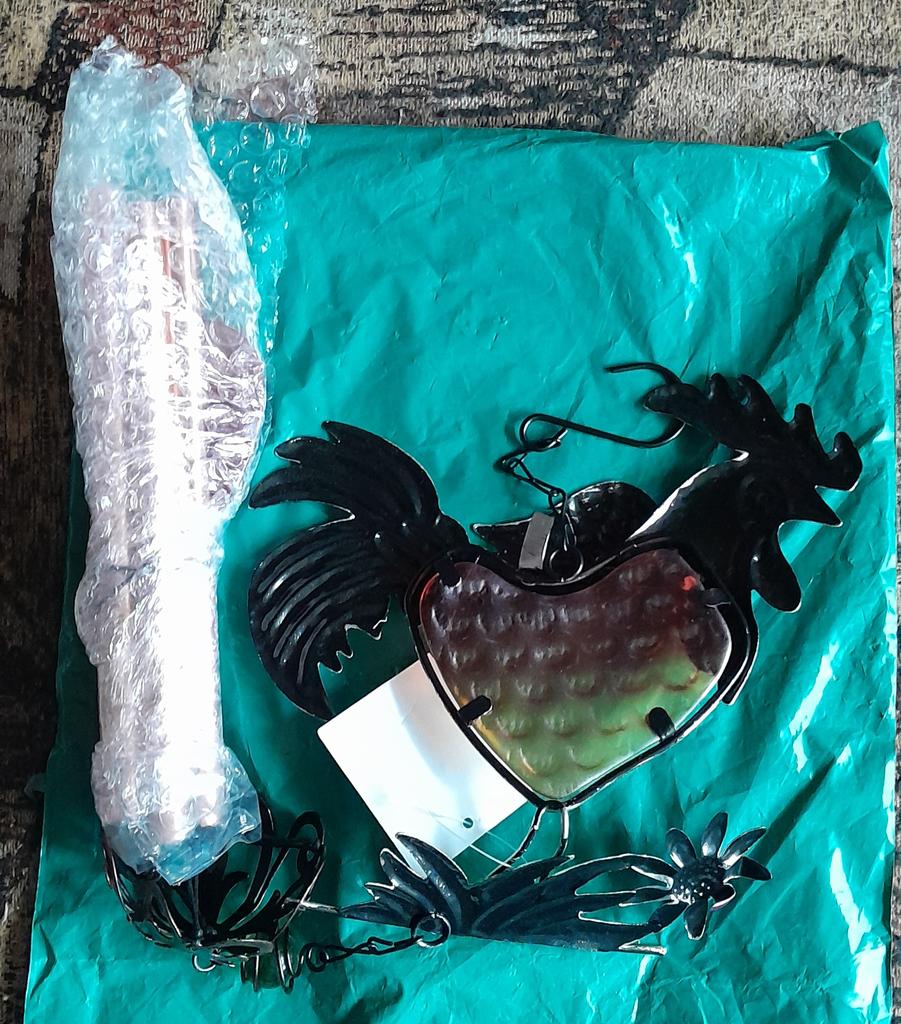 При доставке петуха сильно повредили. Немного поправила, металл мягкий, но краски выпали. Заказала петух с колокольчиком, а прислали петух с железными палочками.
