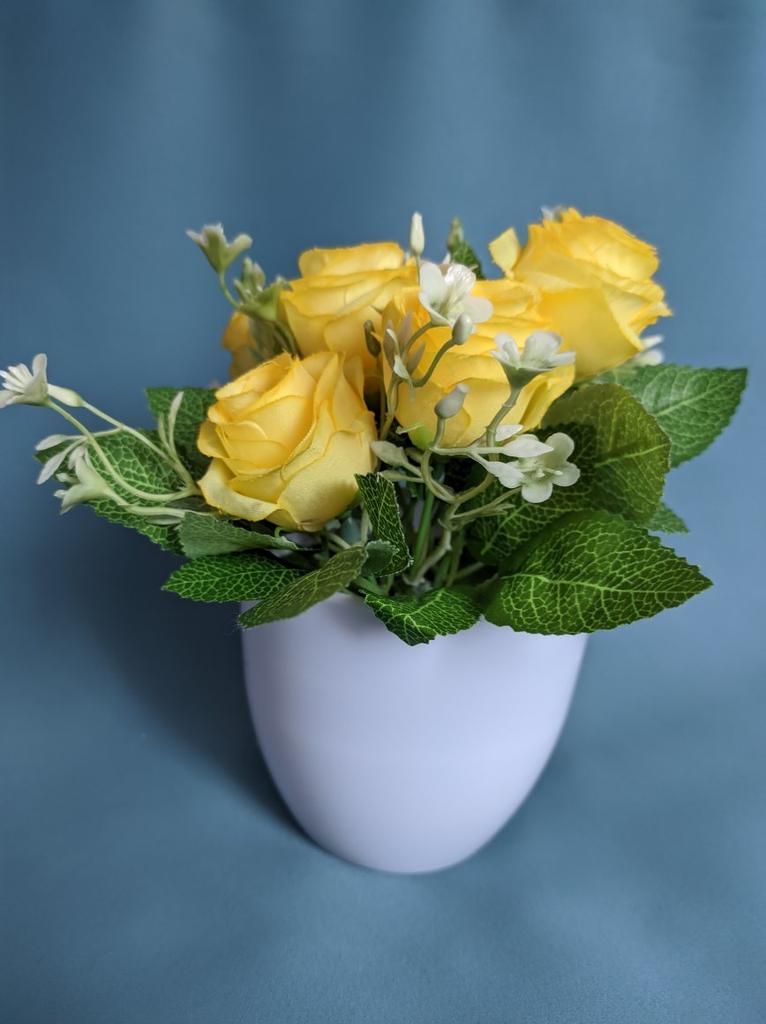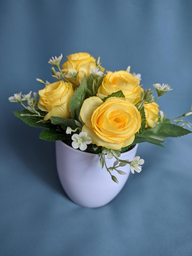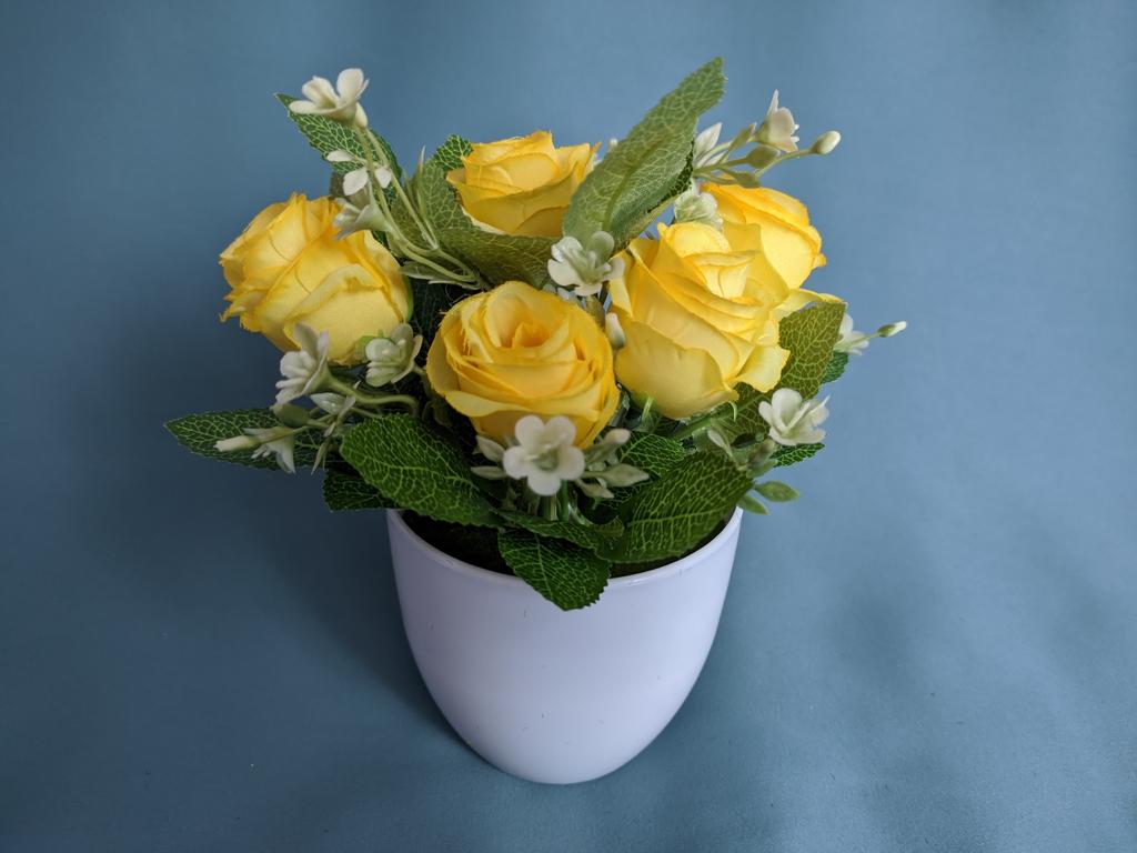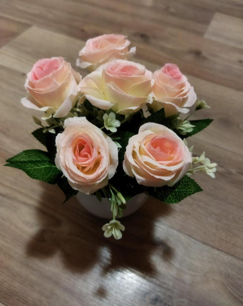 Очень красивый букетик роз. 😍 Купила маме, любит она всякие цветочные композиции. Летом у неё весь двор в живых цветах, а в зимнее время довольствуется искусственными. Не знаю, получится ли подарить. Букет очень понравился дочери. Цветы легко вынимаются из горшочка, и их можно использовать, как реквизит для её выступлений. А если отрезать пластмассовые стебли, из роз можно собрать шикарный венок на голову, посадив цветы на термоклей на ободок. Но возможно, мы просто закажем ещё один букет. У продавца на выбор много расцветок. Цветы приходят в небольшом пластиковом горшочке. Внутри - пенопласт с зелёным напылением-"травкой". В пенопласте - два отверстия, в которые вставлены шесть стеблей цветов. Кроме розочек, на стебельках есть листочки и мелкие дополнительные цветочки, красиво дополняющие букетик. Не скажу, что я большой любитель искусственных цветов, но розы понравились. Если оставлю букет дочери, буду иногда использовать в качестве реквизита при съёмке.