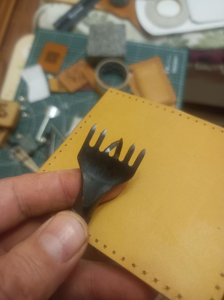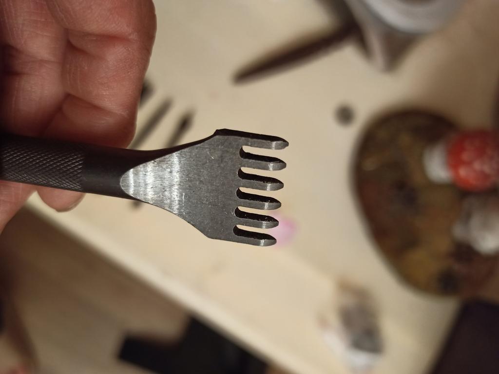 Заказывал пробойники. 3;4;5. Вот с 4мм на 6 зубов была. Последний зуб загнут.. Делал 1 обложку. См фото. Эти пробойники лютое говнище. Не советую покупать. Ни сколько не каленые. Гнутся от пробоя кожи в 2 мм.