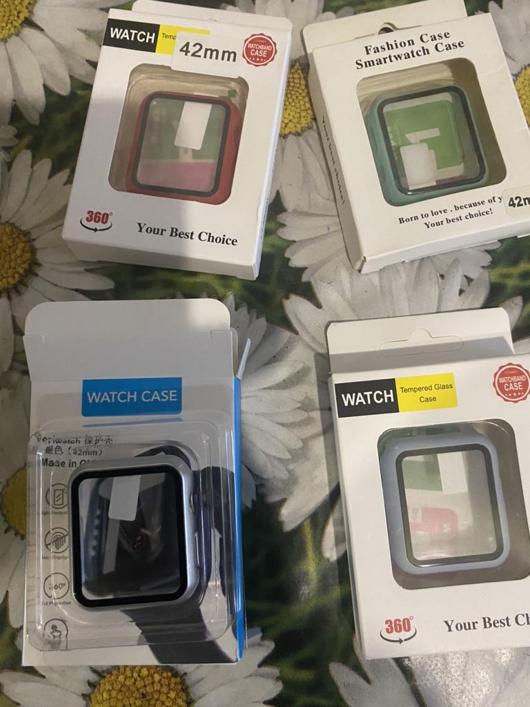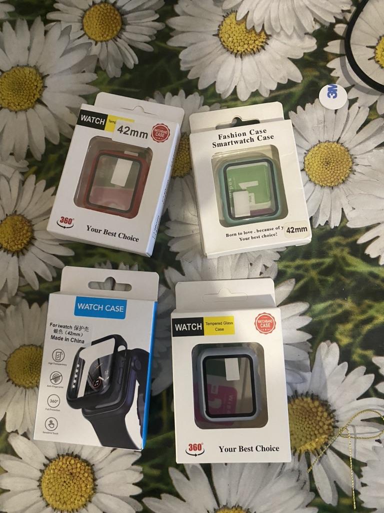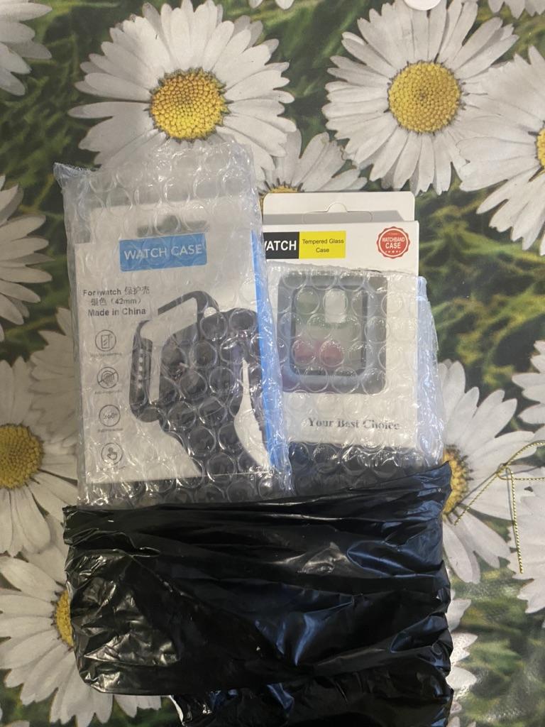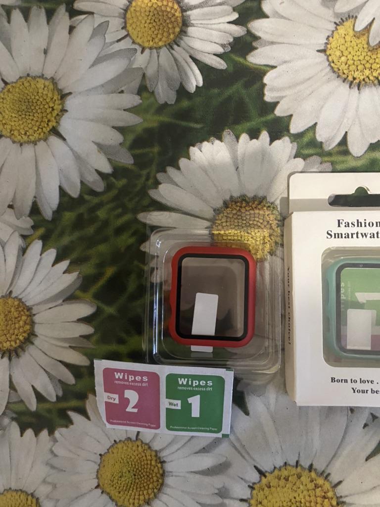Отличный чехол для Apple-watch. Взяла почти все цвета. Упаковано в пупырчатый пакет. К каждому чехлу прилагается салфетка #1 влажная, чтобы обезжирить поверхность и салфетка #2 сухая, чтобы просушить. На стекло с внутренней стороны наклеена защитная пленка. Доставка до Москвы 3 недели