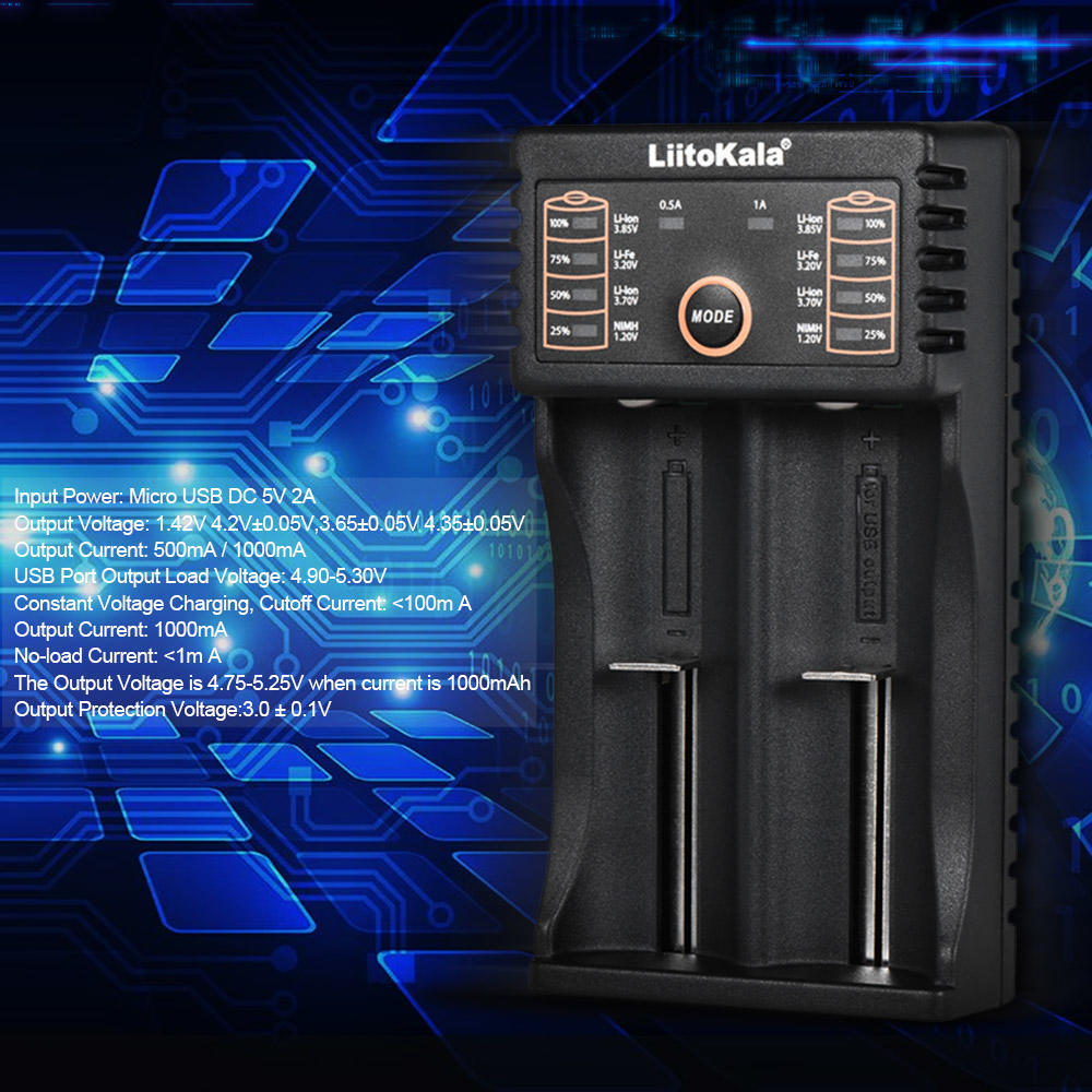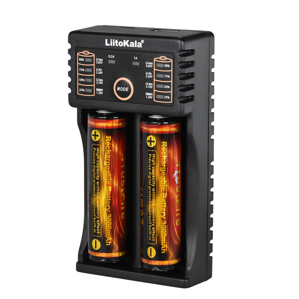 *Два параметра тока зарядки (0,5 А / 1,0 А). Четыре светодиодных индикатора показывают состояние зарядки (25%, 50%, 75%, 100%), а также показывают тип батареи, если вставить в батарею (1,2 В Ni-Mh, 3,2 в Li-Fe, 3,7 в Li-Ion, 3,85 в li-ion).