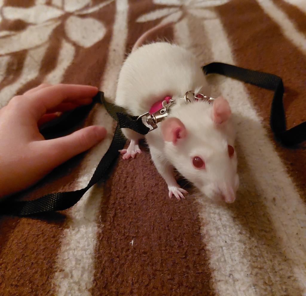 Крыса недовольна, пытаюсь её задобрить любимым лакомством Подошла вторая по размеру, и то впритык ( тем не менее, через 15 минут крыса успела вытащить одну лапку из конструкции) Карабин довольно тяжёлый, надевалось все очень долго и тяжело, маленький карабинчик между звеньями совсем неудобный, очень тяжело открывается, успела сломать ноготь Это не самая удобная шлейка, не знаю, буду ли я её использовать, не хочу мучать животное