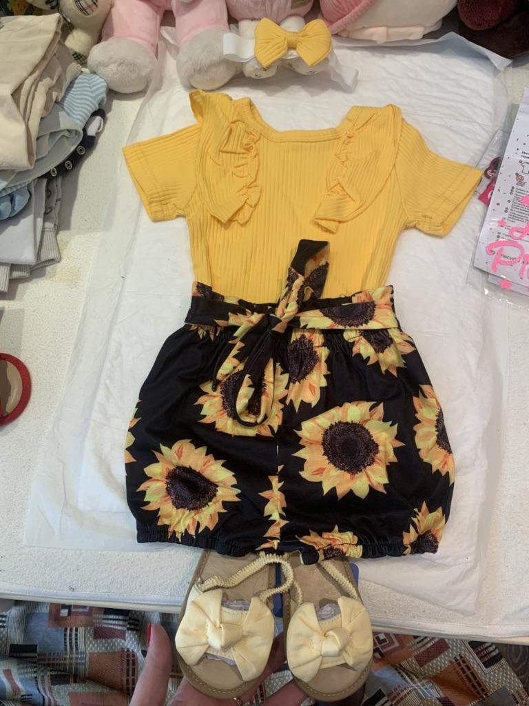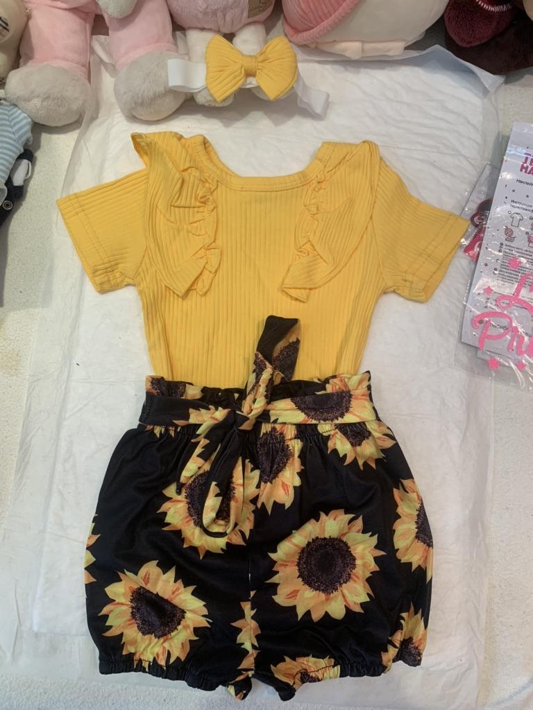 Детский летний модный костюм тройка с принтом подсолнухов: ромпер с оборками шортики и повязка на голову с бантиком — купить товар онлайн с бесплатной доставкой по всему миру!