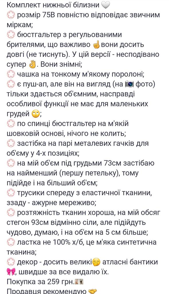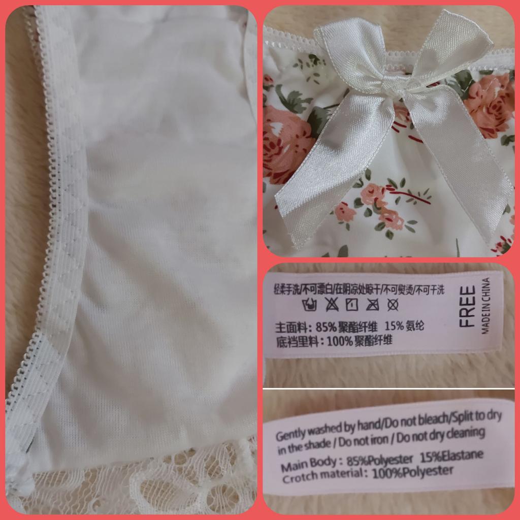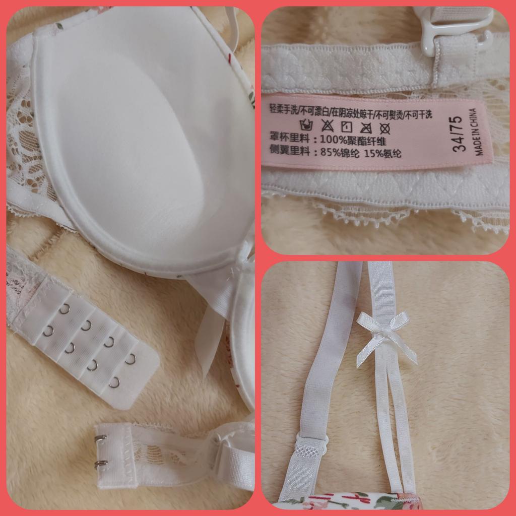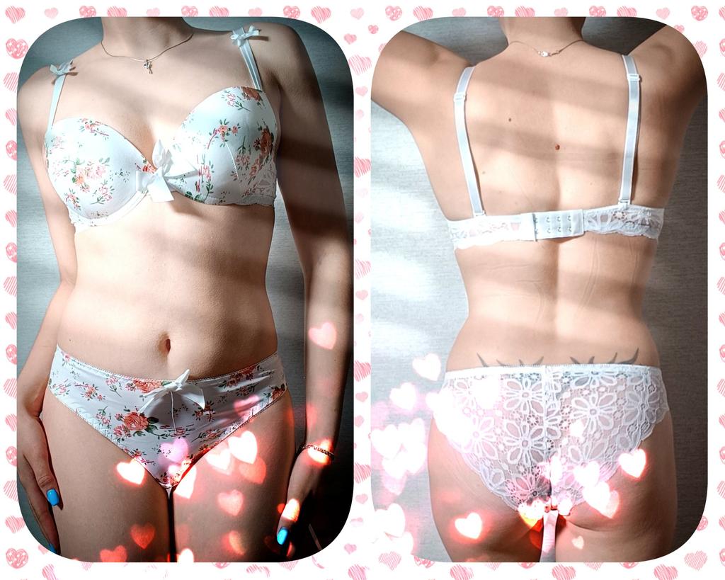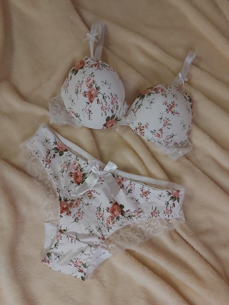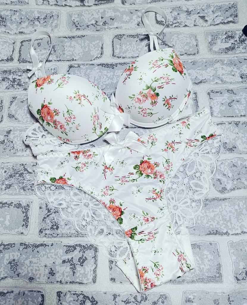 Комплект нижнего белья 🤍 💮 цветочная расцветка на белом фоне; 💮 размер 75В полностью соответствует привычным меркам; 💮 бюстгальтер с регулируемыми бретелями, что немаловажно ☝они достаточно длинные (в последнее время покупала модели с неудачными короткими бретелями, которые на всю длину очень давят плечи). В этом варианте - неожиданно супер 👌; 💮 бретели съёмные; 💮 чашки на тонком 🤏 мягком поролоне; 💮 присутствует пуш-ап, но он зрительно (на 📷 фото) только кажется объёмным, на самом деле особой функции не имеет для маленькой груди 🙄; 💮 по спинке бюстгальтер на мягкой кружевной основе, ничего не колет и не чешется; 💮 застёжка на паре металлических крючков для объёма в 4-х позициях; 💮 на мой объём под грудью 73 см застёгиваю на самый минимальный (первую петельку), поэтому подойдёт и на бо'льший объём; 💮 трусики спереди из эластичной ткани, сзади - ажурное кружево; 💮 растяжимость тканей хорошая, на мой объём бёдер 93 см отлично сели, но подойдут прекрасно, думаю, и на объём на 5 см бо'льше; 💮 ластовица не 100% х/б, это мягкая синтетическая ткань; 💮 декор - достаточно большие атласные бантики 🤭, скорее всего удалю их. Спасибо Joom 🤍 Продавца рекомендую 🤝
