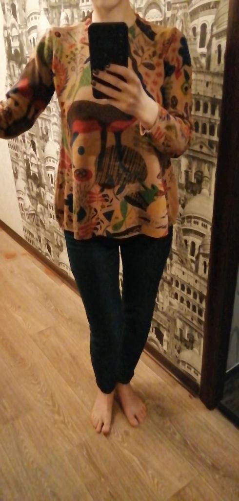 Цвет рыжий прислали, т. е. коричневый в их понимании, а не хаки, какой я заказывала. Может, фото Джума, как часто, врет. Постараюсь поменять. Для маленьких: у меня размер XS, и проем рукава прям под мышкой; в груди чуть-чуть - и тесно было бы, притом что у меня груди вообще-то нет. Кофта висит колокольчиком. Красиво. Стройнит. Плотная, без дыр и затяжек. Рисунок четкий, насыщенный. Вернули половину стоимости товара.