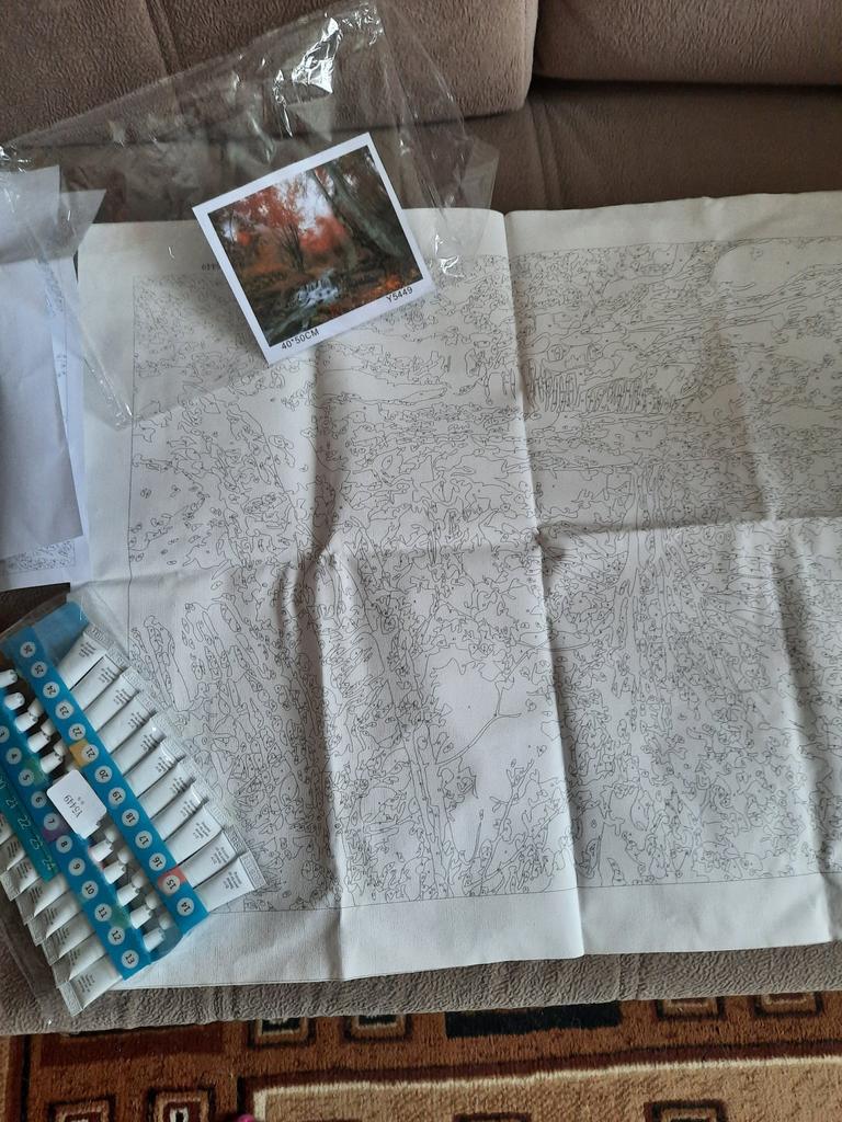 В комплекте полотно, краски, кисти, вобщем-то все как в описании. Краски все целые. На мой взгляд должен получится очень даже красивый пейзаж.