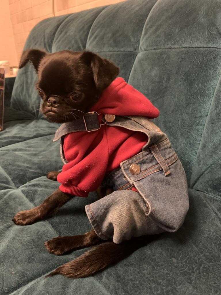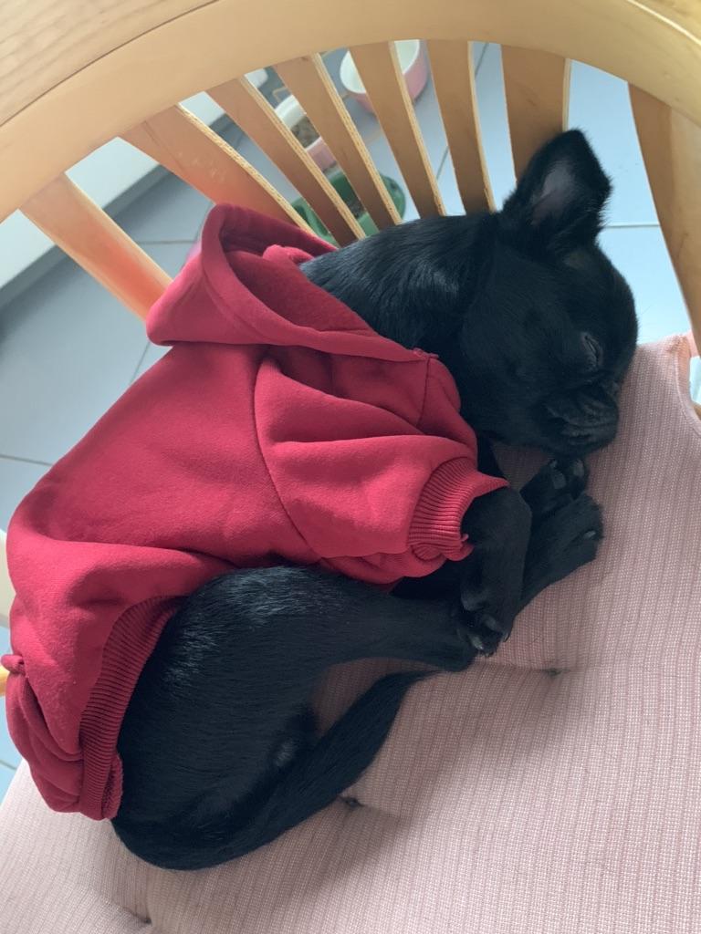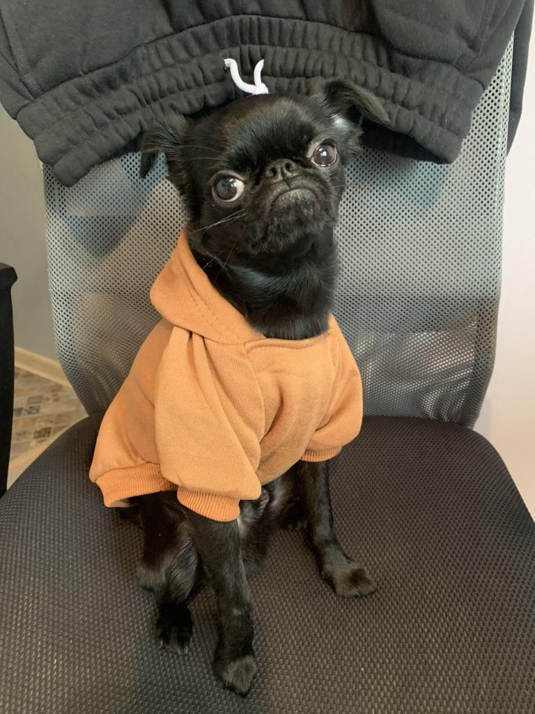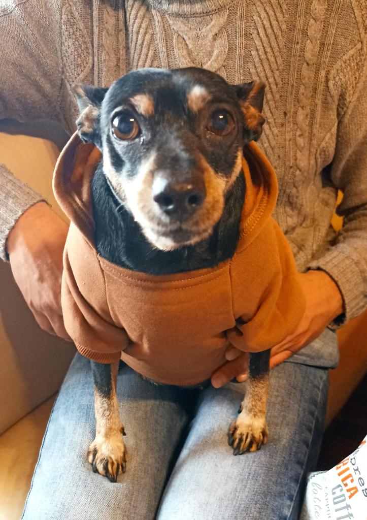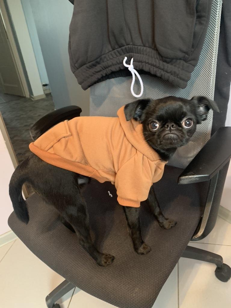 Толстовка пришла вместе с другими заказами. Сначала думали, что она налезет только на кошку, но потом примерили собаке, оказалась впору. Она подходит скорее для коротконогих собак. Смотрится симпатично. С начёсом:) Не понравилась разная ширина манжет, правая на 3 см уже, чем левая.