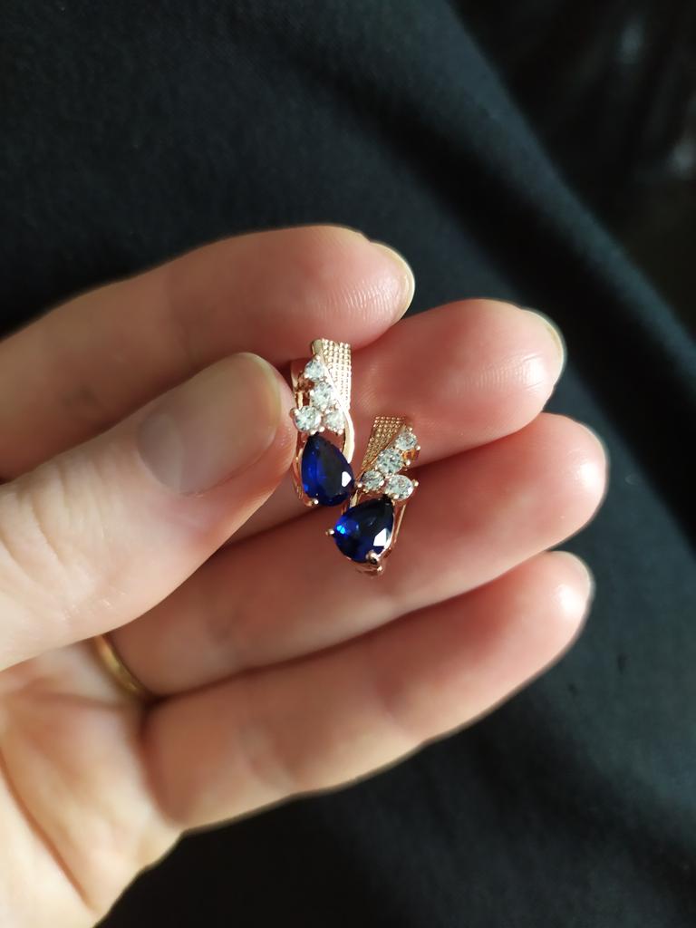 Красивые и компактные серьги с синим камнем, как и заказывала, замочки вроде работают, пока держат крепко, в носке пока не пробовала. Посылка шла до г.Алматы 1,5 месяца. Были упакованы в пузырчатый пакет, отдельный целофановый зип-пакетик и лежали ещё в чёрном матерчатом мешочке. Камни все на месте. Красиво блестят как при естественном освещении, так и искусственном свете. Похоже на золото, для ежедневного применения подходят хорошо. Надеюсь, что и цвет держаться будет, и напыление не слезет от воды. Дополню отзыв позже. Продавца рекомендую, спасибо, Джум.