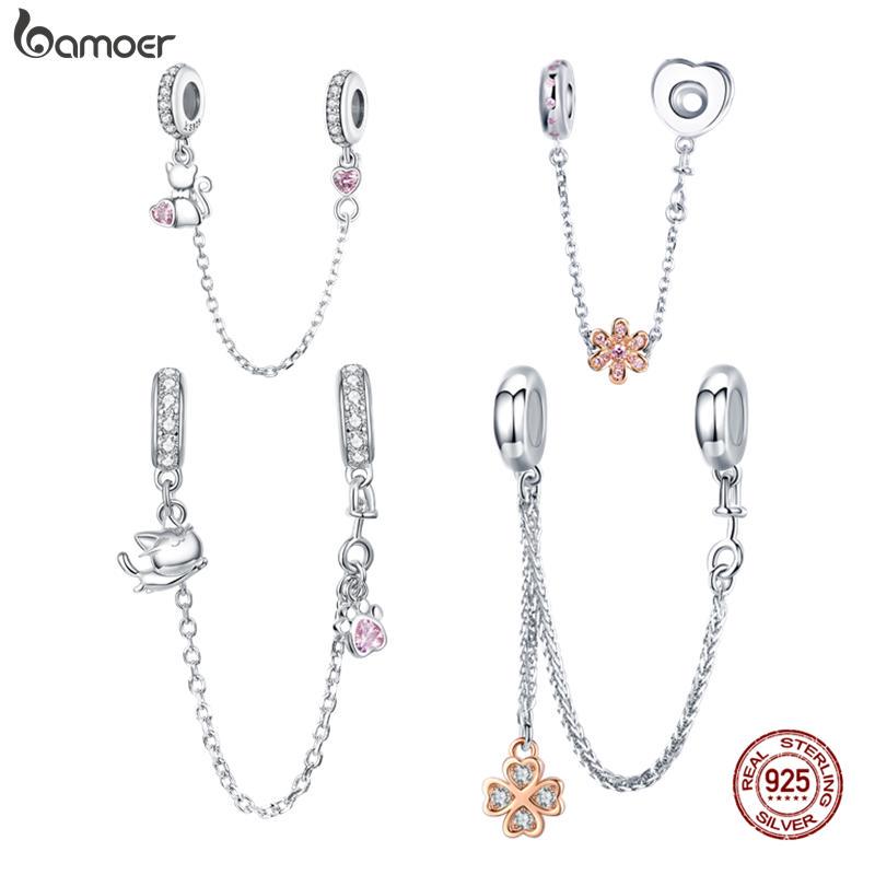 BAMOER 925 Stelring Silver Защитная цепочка Kitty Cat Четырехлистный клевер Подвеска подходит для оригинального браслета Ювелирные изделия