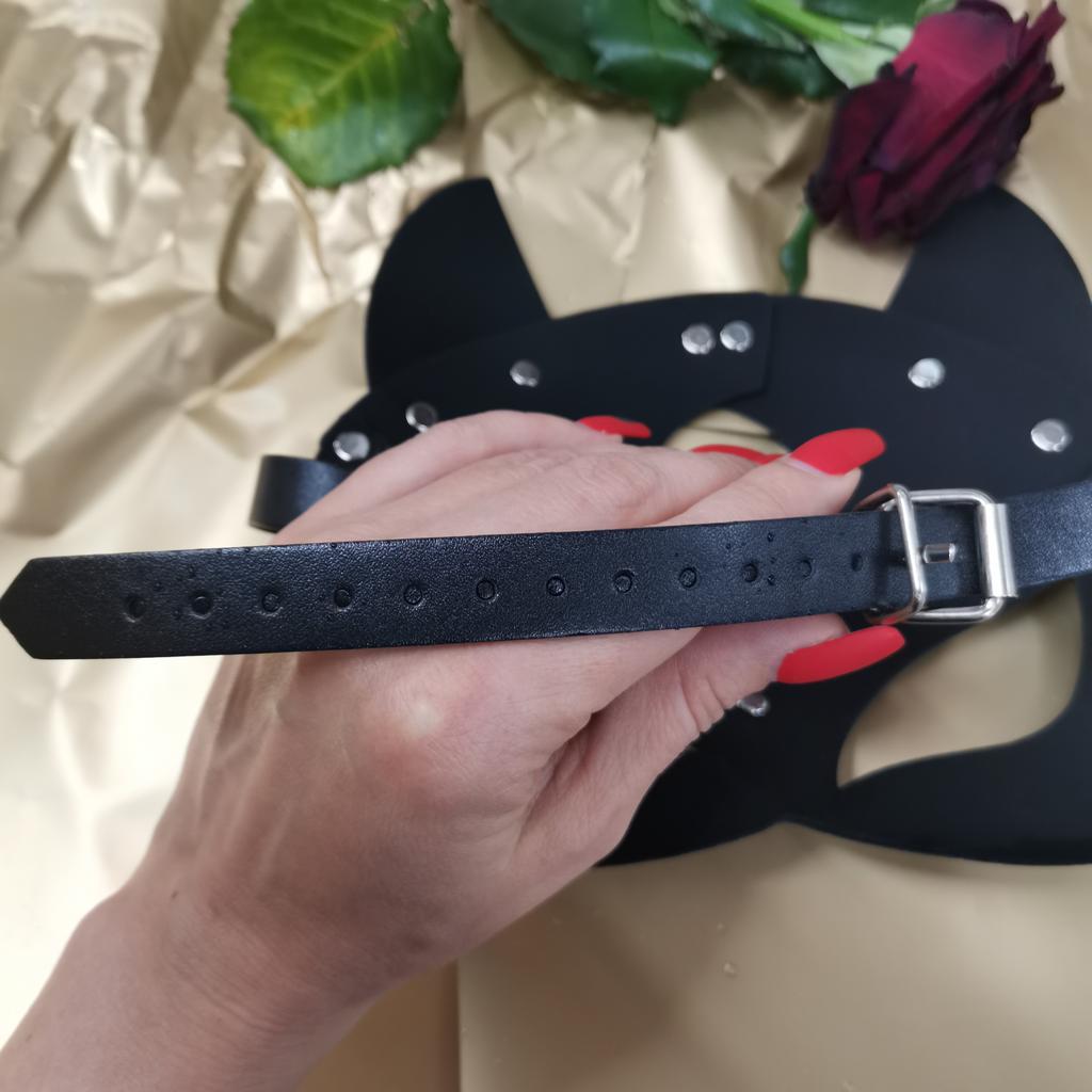 Классная маска 😻 Очень аккуратно выполнена 🔥 Заклёпки ровненькие. Качественная, очень приятная на ощупь 🥰 Внутри мягкая ❤️ Ремешок регулируется на любой объём головы 😇 Купила для фотосессии. Потом покажу результат 😻 За эти деньги просто подарок, а не маска 🥰