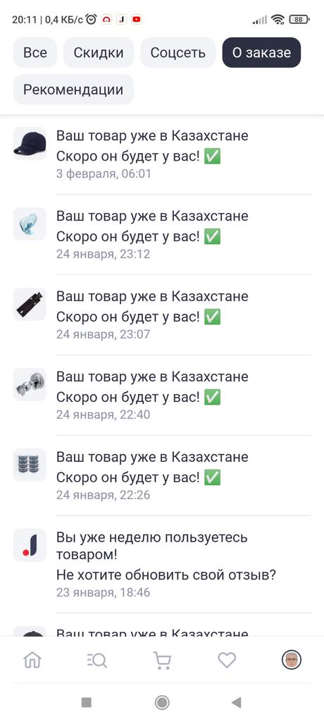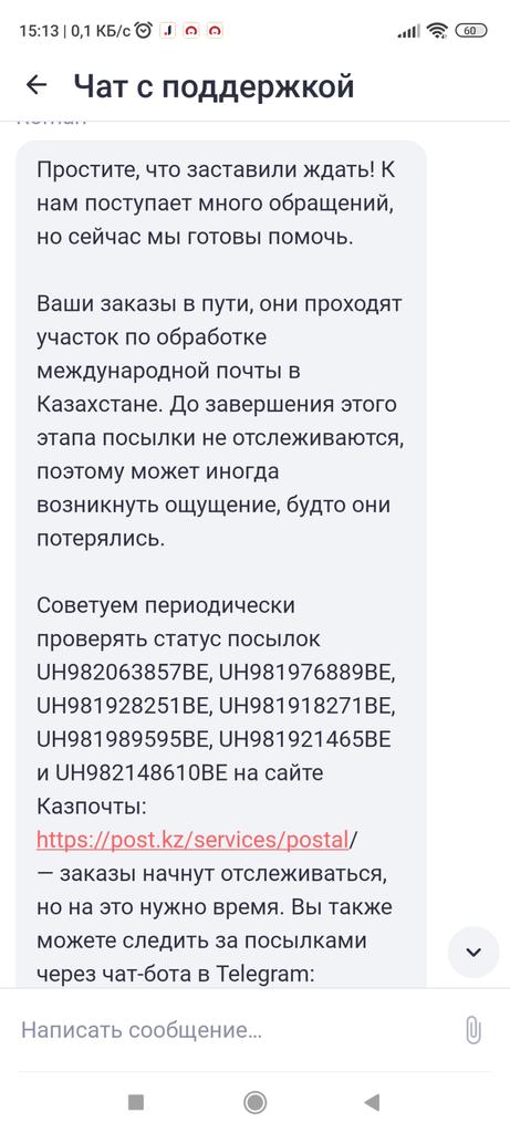 В ноябре месяце 2022 года я оплатил и заказал в Joom 6 (шесть) наименований товара. До сегоднешнего дня 21.02.2023 эти заказа не пришли. Обратился в службу поддержки , они ответили что бы я обратился в Казпочту и отслеживал по идентификационному номеру. Но бот ответил что товара не обнаружен. В Казпочту Я обратился с письмом , Казпочта ответила: UH982148610BE , UH981921465BE ( 2 раза написали Вы) , UH981989595BE , UH981928251BE, UH981976889BE, UH982063857BE и UH982148610BE - на данный момент нет прибытия на территорию РК. Просим отслеживать посредством нашего официального сайта: post.kz и ожидать обновления информации. После поступления на территорию РК - данные обновятся и посылка будет отражаться на нашей территории. При нарушении сроков - просим открыть спор с продавцом/уведомить отправителя. Дополнительно уведомляем Вас о том, что статус "VPS" - это транзитная зона, не территория РК. Информация из любых сторонних источников не признается корректной, так как не подтверждается нашей системой отслеживания почтовых отправлений. Благодарим Вас. Сотрудники Joom где мои заказы?