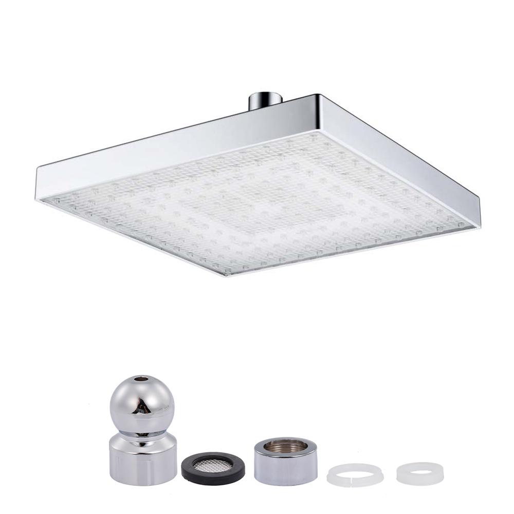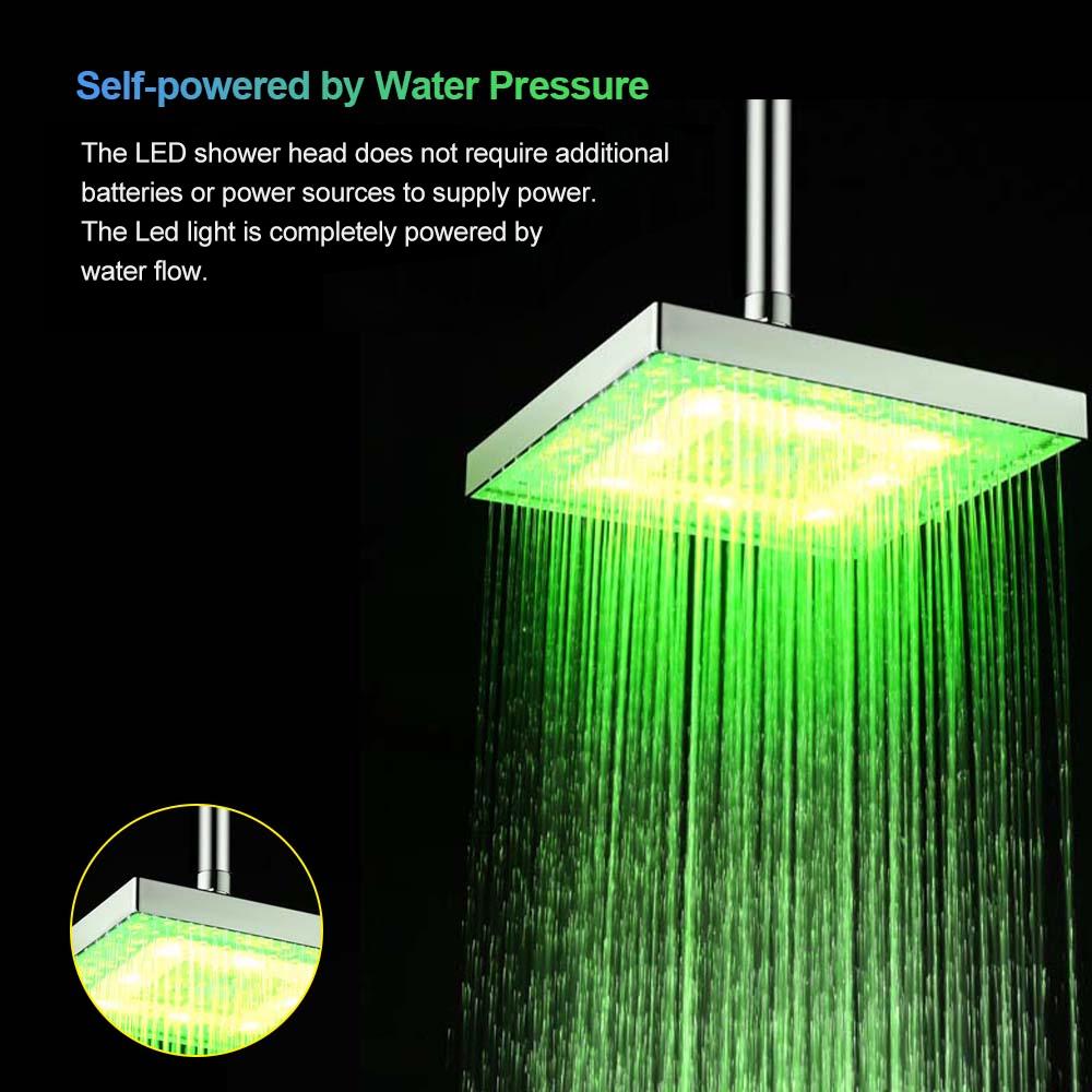 Это 8-в квадратных осадков душевой головки со светодиодными огнями может вытекает из воды с великолепным светодиодным светом светящиеся. Он полностью питается от потока воды, нет необходимости в дополнительных батарей или источников питания. Светодиодная душевая головка может сделать вашу душевую комнату красочной мечтой мира, и сделать монотонное купание весело и романтично.