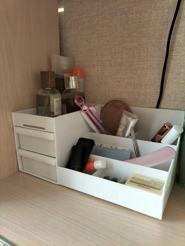 Органайзер для косметики маленький, отдала соседке, она пристроила для пузырьков и мелочей. Простой, ничеособеного. На фото органайзер смотрится большим, на который помещается много всего, это не так.