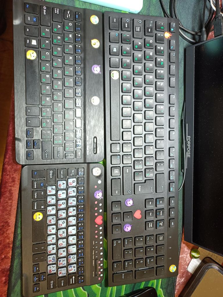 Все клавиши рабоют Вот сравнение маленькой, средней и обычной проводной полной клавиатурой - Расскладка конечно английская и наклейки приходится докупать отдельно, или ручное творчество из лака для ногтей и перманентных маркеров) - с клавишами как повезет. Например в маленькой у меня один шифт не работает. - так же в маленькой не влезает весь русский алфавит и если вам нужно печатать на русском то берите минимум среднюю - на андроиде знаки припинания приходится искать методом тыка. На виндоус все впорядке. - нет клавиши Delete. Home, End и тп доступны через Fn и в комбинациях клавиш могут не срабатывать, ведь клавиатура кажется распознает только 3 одновременно зажатые клавиши - к андроиду подсоединяется как физическая клавиатура, некоторые настройки могут сбиваться, рекомендую ставить экранной клавиатурой стандартную если у вас другая