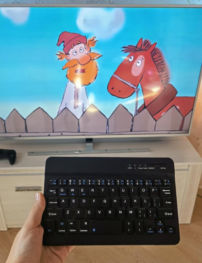 Беспроводная клавиатура ⌨ Брала для смарт-тв. Очень лёгкая, компактная, удобная. Работает с любым устройством, имеющим Bluetooth Устанавливается просто, без всяких драйверов и т. д. Клавиатура имеет английскую раскладку, кнопку вкл-выкл, кнопку Bluetooth с подсветкой, заглавный шрифт. Остальные клавиши стандартные. Клавиши бесшумные, достаточно крупные. На выбор есть разные цвета и размеры, у меня самый маленький 20х12,5 см В целом, товар понравился, выглядит достойно и работает исправно. Но для меня самый главный недостаток, что клавиатура не русифицирована. То есть на русском языке (и ни на каком кроме английского) ни при какой возможности с помощью неё писать нельзя 🙄