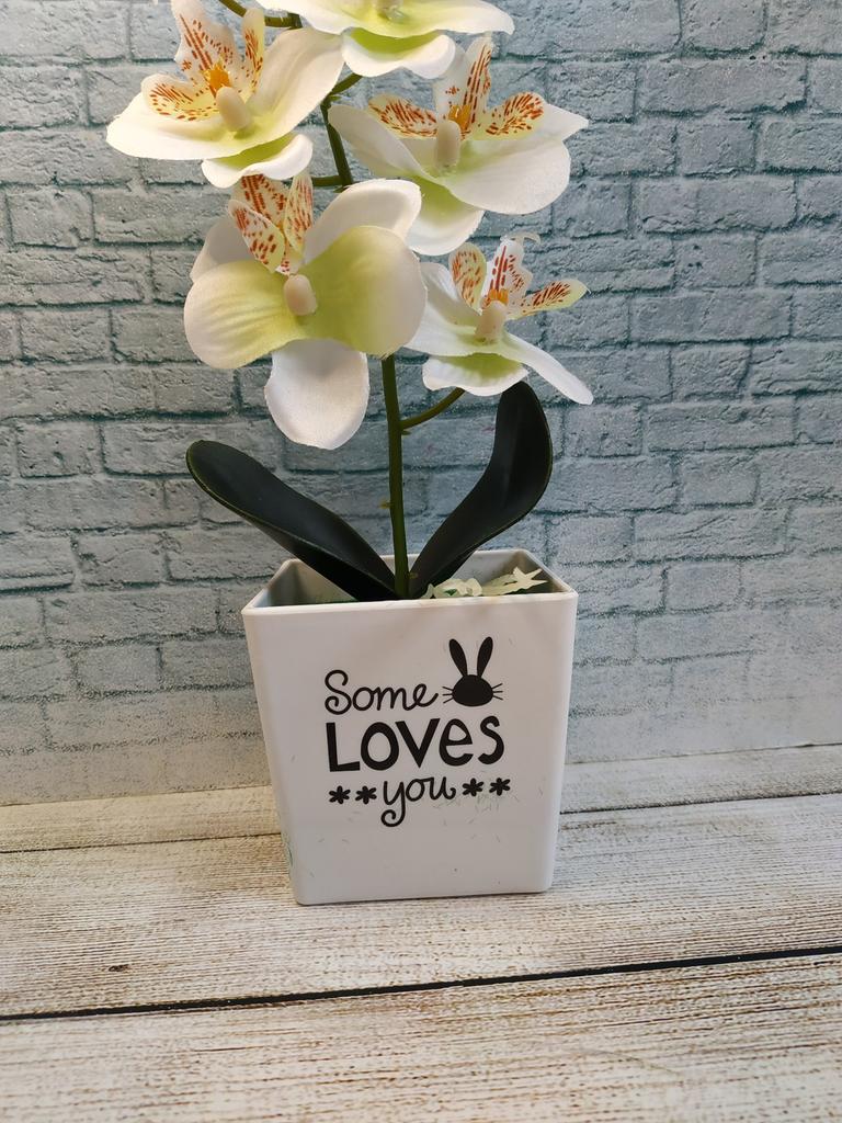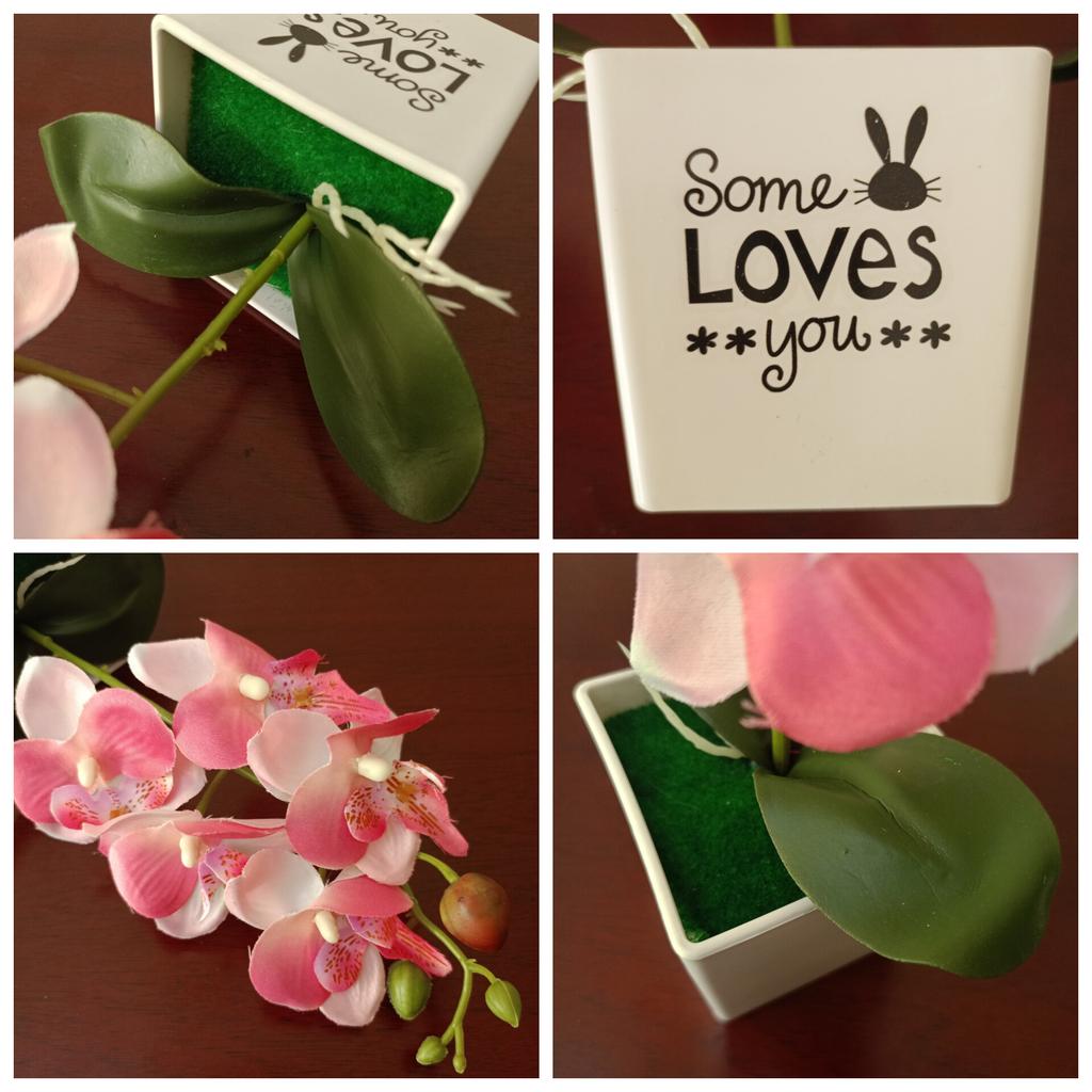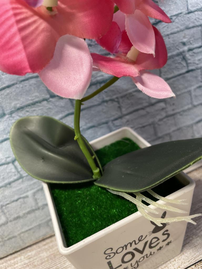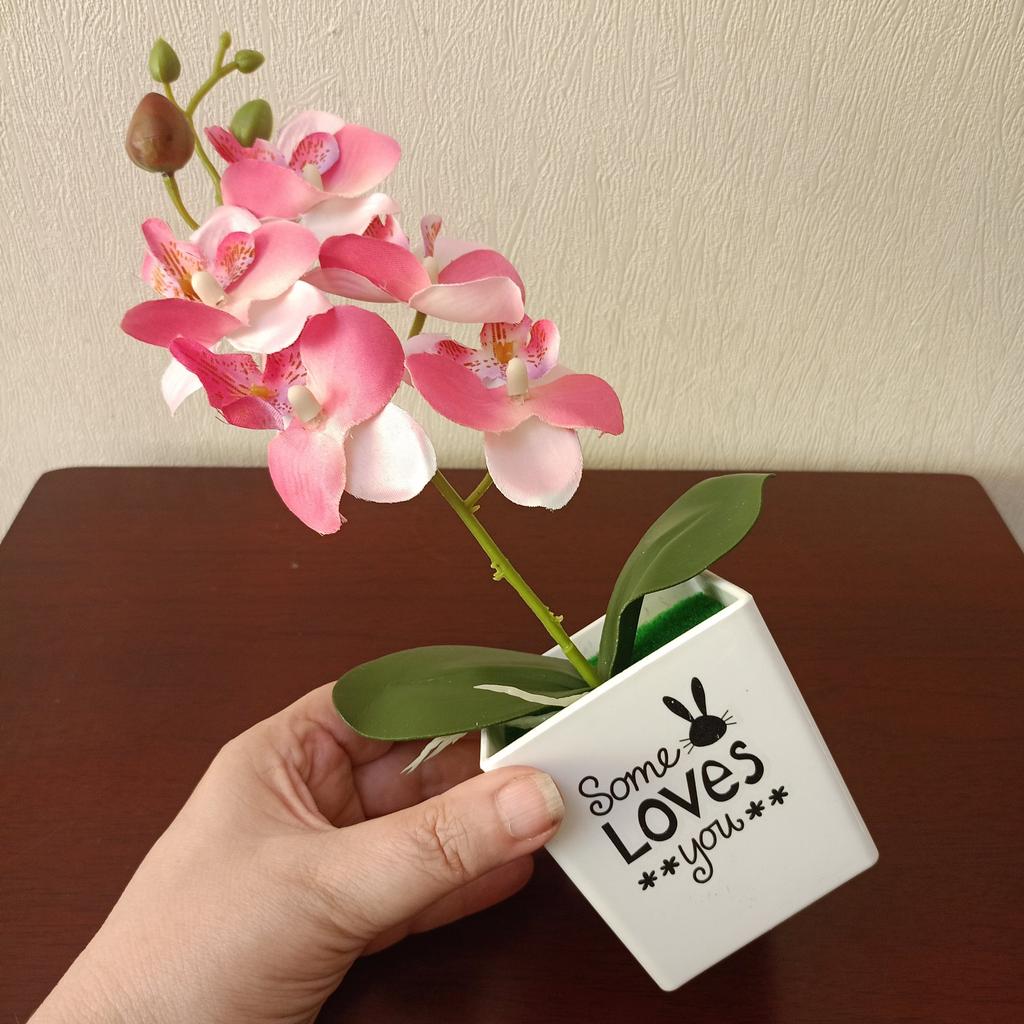 🌺ИСКУССТВЕНАЯ ОРХИДЕЯ В ГОРШКЕ🌺 Очень милое украшение для интерьера Вашего дома! Я разместила эту орхидею на свой туалетный столик. Орхидея выполнена вполне реалистично. Её цветы изготовлены из ткани, а зелёные листья из латекса. Высота орхидеи вместе с горшком составляет 28 см. Горшок выполнен из пластика. Спереди его украшает милый декор в виде зайчика и надписи Some Loves You, что в переводе с английского языка означает: некоторые любят тебя. Размер горшка составляет 6*7*7,5 см. Внутри горшка размещён искуственный зелёный мох. Сама композиция лёгкая, но устойчивая. Получила я её без коробки. Орхидея была упакована в целлофановый пакетик. К качеству изготовления претензий нет. Постороннего запаха орхидея не имеет. Могу рекомендовать этот цветок для украшения Вашего дома или для оформления фотографий.