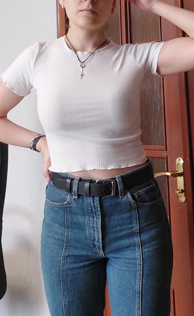 Вообще ношу с, но м подошёл идеально. Ткань хоть и синтетика, но вроде ничё такая, приятная, но в общем выглядит топ не роскошным, но за сали деньги ок, род что-то очень даже подойдёт (под пиджак/рубашку и тп). Специально ставлю пару фоток с чёрным бюстгальтер, чтоб было видно степень просвечивания. С бежевым бюстгалтером всё хорошо.