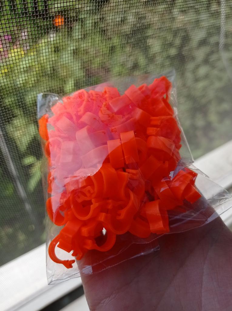 Заказывали 30.07, кольца пришли 24.08. Пакет целый, без видимых повреждений. В пакете, как и заявлено, 100 целых колец. Кольца лёгкие, крепко держатся на лапах. Отлично пойдут на ногу голубя или птицы такого же размера (имхо, берите 10 мм). Важное замечание - эти кольца малы для взрослой крупной сельхоз птицы и велики для мелких певчих и попугаев. Но ими вполне можно кольцевать цыплят/перепелов.