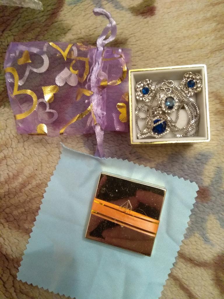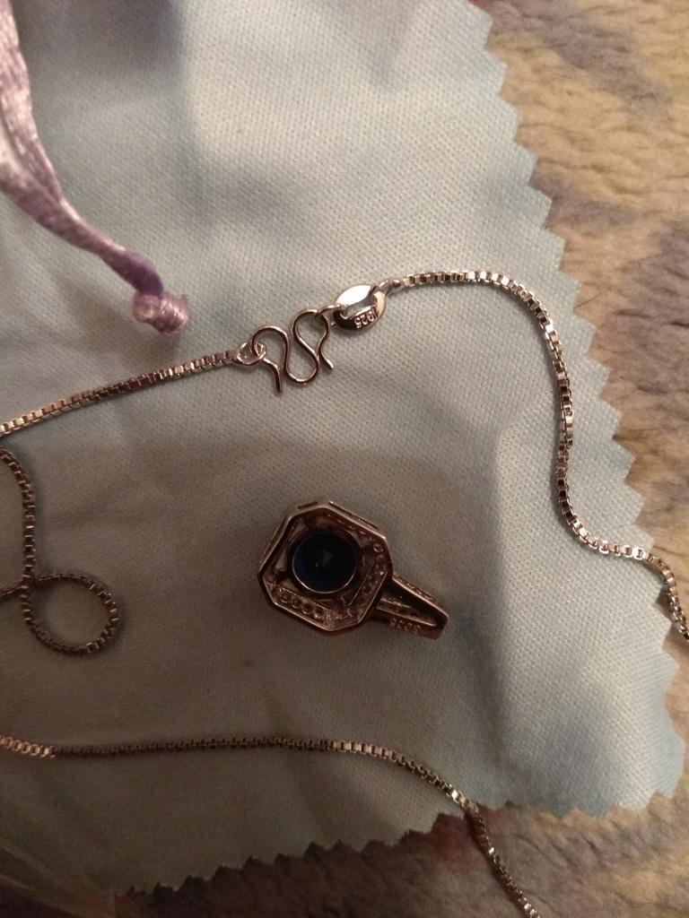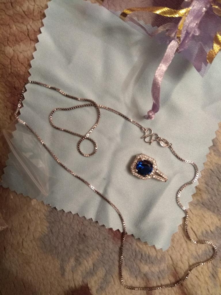 Получила ожерелье по почте. Доставка 15.04-16.05.2021, трек отслеживался полностью. Упаковано в коробку, в ней были: 1) тканевая салфетка голубого цвета; 2) прозрачный мешочек с рисунком (сердечки); 3) цепочка и кулон (отдельно упакована только цепь). Цепочка отличного качества, стоит проба 925°, на кулоне с синим камнем тоже на обратной стороне проба 925°!! Украшение симпатичное, можно принять за серебро🥈.