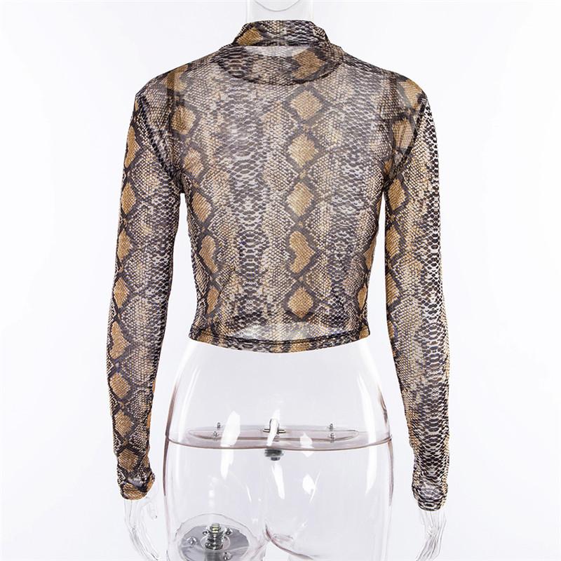 Повседневная футболка с зеленым змеиным принтом, женский сетчатый топ, с длинным рукавом, прозрачная женская футболка из змеиной кожи, укороченные топы с высоким вырезом