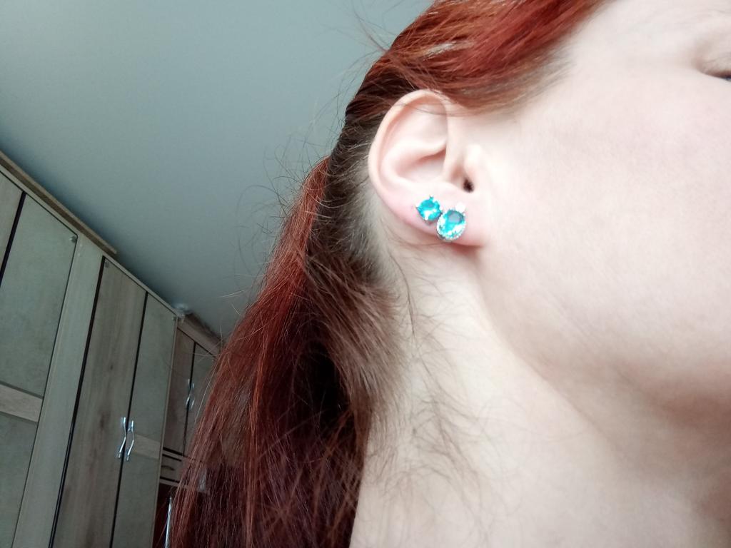 Прелестные сережечки- гвоздики . Камешек стеклянный с огранкой. Шириной 6 мм. Заглушечки металлические. К ним подобрала еще и кулончик. Мне мой выбор понравился. Смотрятся красиво. Дополняю - при каждодневной носке - уши не болят, цвет не изменился. Закажу еще в другом цвете. Рекомендую.