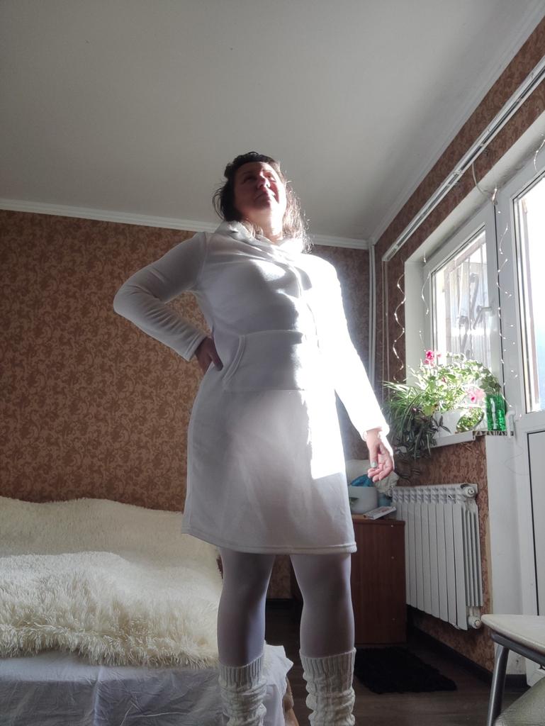 Платье мне здесь в моей жизни на Красной поляне в Сочи подходит. Но если бы я увидела его в магазине, я бы ни за что не купила. Я скорее всего даже не посмотрела бы. И уж точно бы не померила бы. Потому что ткань выглядит как пародия на ткань. Фото со спины - видите как топик просвечивает? Но вот оно мне пришло среди лета. Развернула, изумилась, заметила пятно. И что-то не стала морочиться, и отложила в шкаф. Постепенно собрала весь белый комплект. Пуховичок такой же тонкий, колготки, гетры, кроссовки (и межсезонье, и зимние), и даже нарукавнички (полуперчатки или полуварежки) с прошлой зимы ждут. И где-то едет манишка вязанная в заказах. Ещё завела себе кислородный отбеливатель - пятно на груди выведу. Зато прямо сейчас - осенью с сильными перепадами температуры день/вечер - мне хорошо, уютно и нарядно. Совсем не могу теперь носить темную одежду.