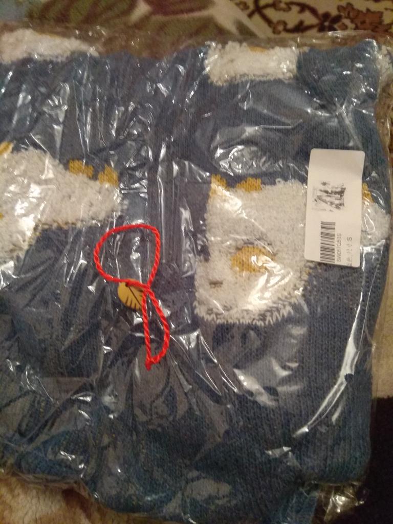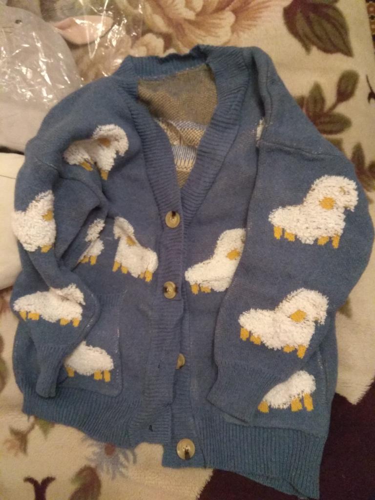Свитер с овечками. Качество вполне отличное, видно он вязанный вручную. Пуговички все есть, размер подошёл идеально по плечам 40 см, объемам, рукавам 61 на 49. В Минск доставка 2 месяца 29.11.-21.12.22 на почту. Кроме того в подарок продавец положил веревочку фэн-шуй★!! Дополняю: рукава коротковаты (наподобие 7/8 размер)..