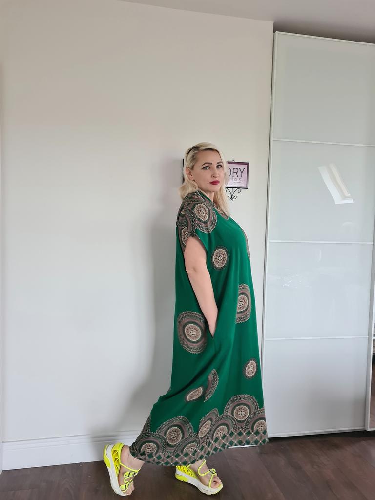 Красивейшее пляжное платье на лето на плюс сайз девушек и не только.Платье очень свободное,лёгкое,очень мягкое и приятное к телу.Материал не просвечивает,похож на вискозу, но с примесью полиэстера наверно.Платье макси,можно одевать свободного покроя или с поясом.V вырез спереди,3 глубоких кармана с боков.В магазине выбор из 3х цветов,мне очень понравился зелёный.На размер 100/80/100см очень свободное и то что нужно на море.Размер в груди до 150см.Доставка 3 недели в Ирландию.Счастливых покупок!