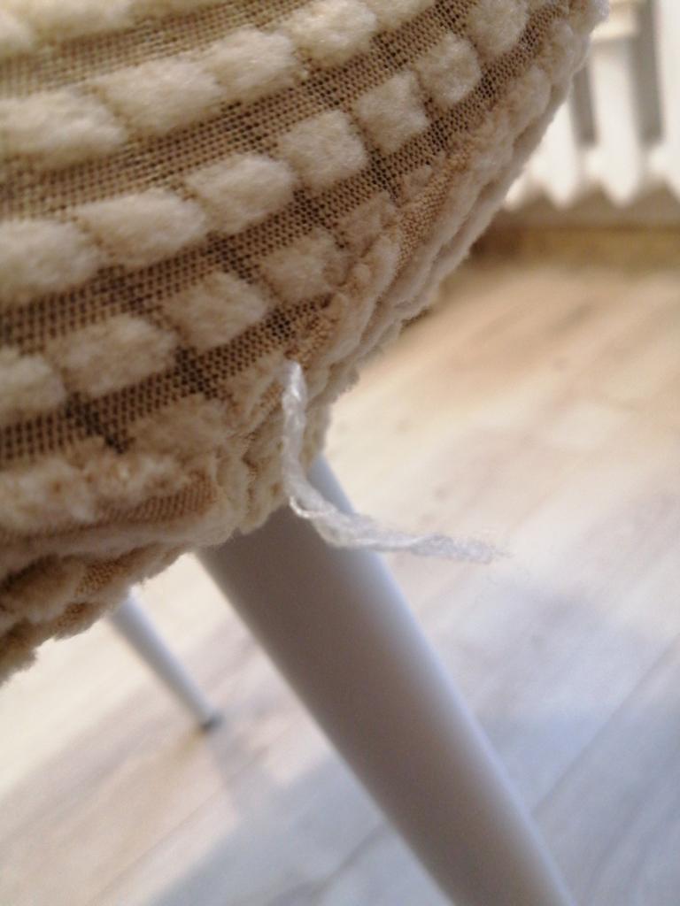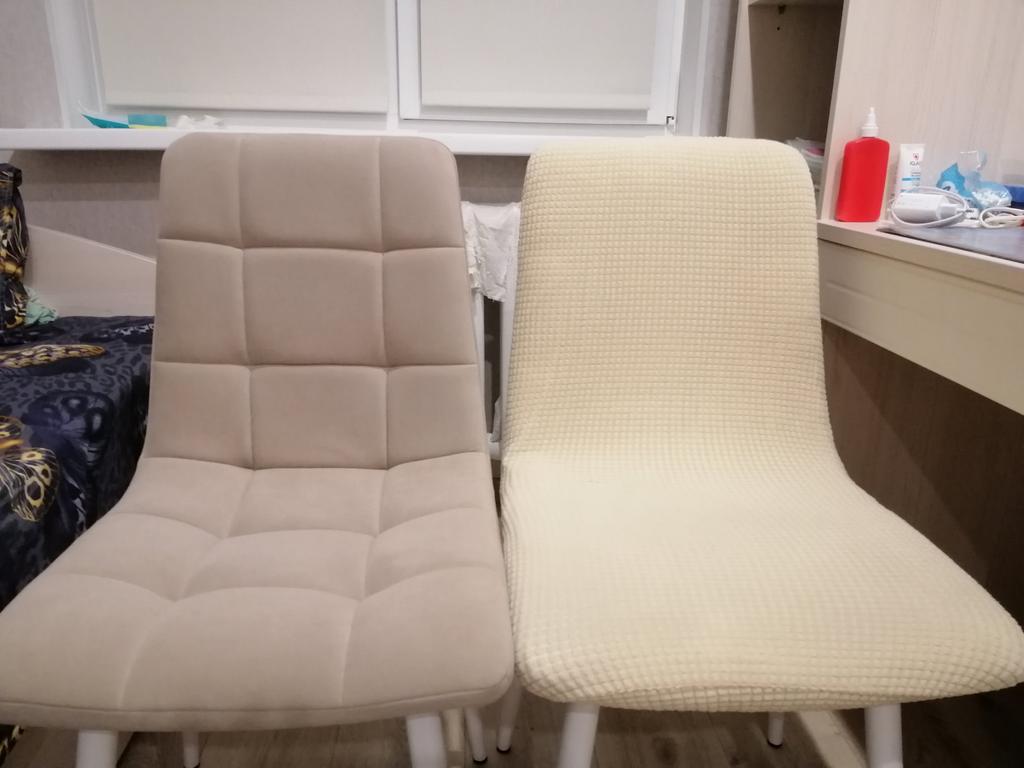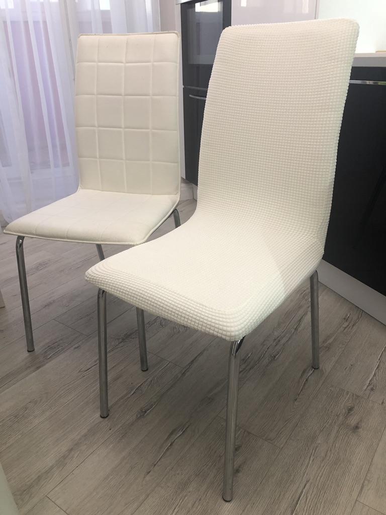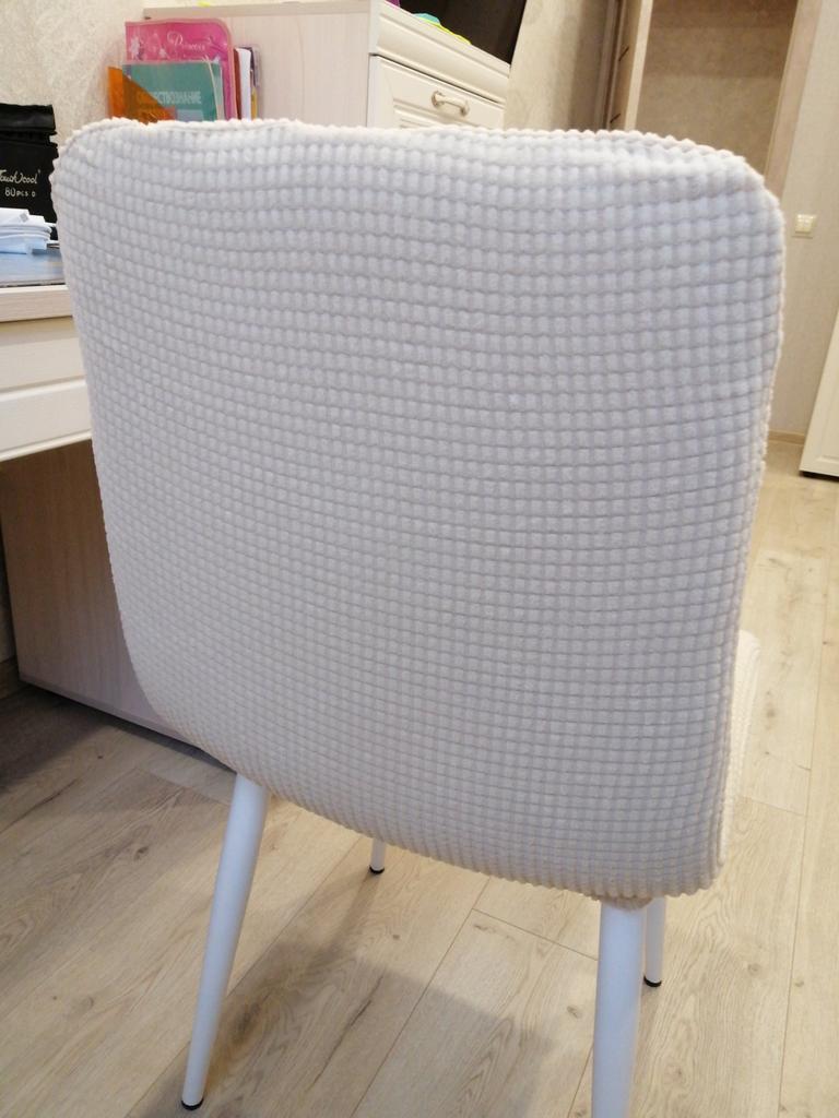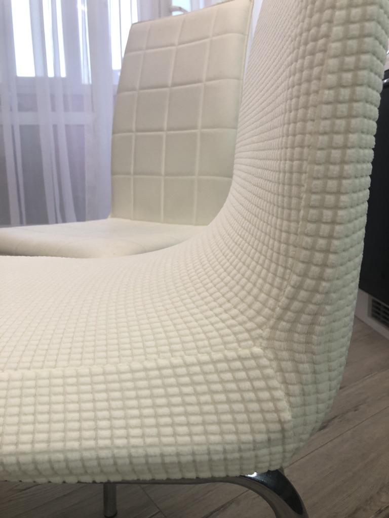 Купила чехлы на стулья за 722₽(за 2 шт.) Что в итоге?… Качество очень даже неплохое. Швы ровненькие, лишних ниток нигде не заметила. Ткань мягкая (синтетика, но приятная). Цвет, как бы это странно не звучало, идеально подошёл (заказывала белый,по факту немного кремовый (на фото видно, что резинка белее),не отличить от «родной» обивки стула. Размер…на стул (спинка 54см., сиденье 44см.) натянула, но оказалось маловато… На фото видно, что на изгибе стула чехол не лёг как надо. Доставка была очень долгая (31.07.-15.09.) Продавца рекомендую, потому что цена+качество соответствуют.