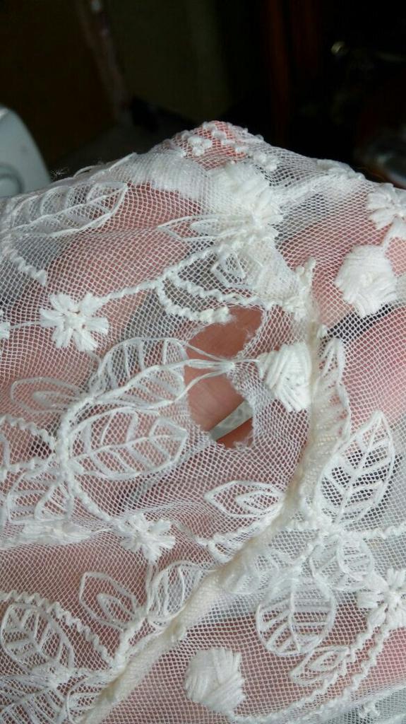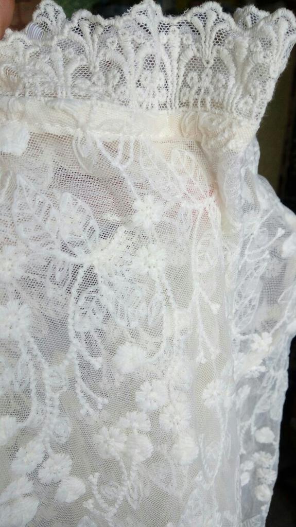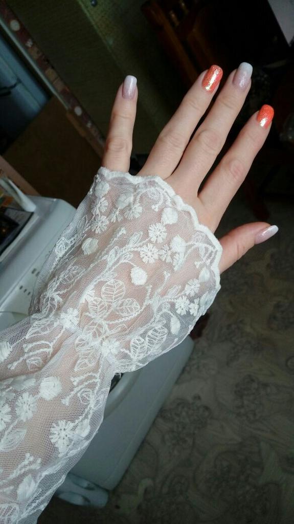 Цвет абрикосовый , кружево немного жестковато . Ещё не стирала , возможно , что после стирки станет мягче . Кружевной воротник - стоечка , придется подворачивать : чтобы на шее смотрелся не так свободно - и это при том , что голова проходит можно сказать , с небольшим усилием . Сзади есть небольшая пуговица , которая застёгивается на петлю . Цвет приятный . Подходит на размер 42-44 . Рукава не такие пышные , как на фото продавца , на самом деле , они скромнее по объему . В целом , довольна .