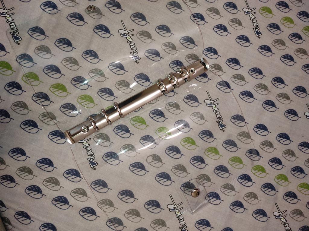 Обложка плотная. Все целое. Зажимы, кнопка - все работает. Расстояние между кольцами стандартное, поэтому подошел блок для 6 колец. Все замечательно. Спасибо за доставку (шло ооооочень долго.. до Свердловской области почти два месяца).