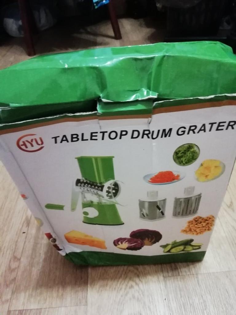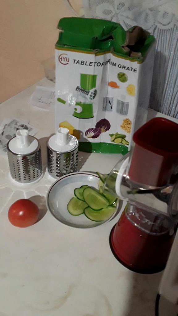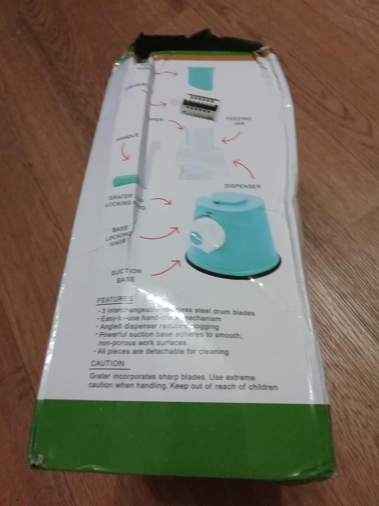 Заказ шел 20 дней.Упакована хорошо в коробке,все детали в пакетах.Коробка помята,но это почта.Сама терка целеханька без помарок.В работе легкая.Блокировка стола слабая на пластике,может я еще не освоилась.В описании написано соединение со солом в ходе работы.Посмотрим. Языков не знаю,дошла своим умом-терка хорошая,самое главное на кухонном столе стоит твердо не калышется.Продавца и товар рекомендую,дешевле остальных Терка преназначена для подарка.время еще не настало.в конце месяца отпишусь