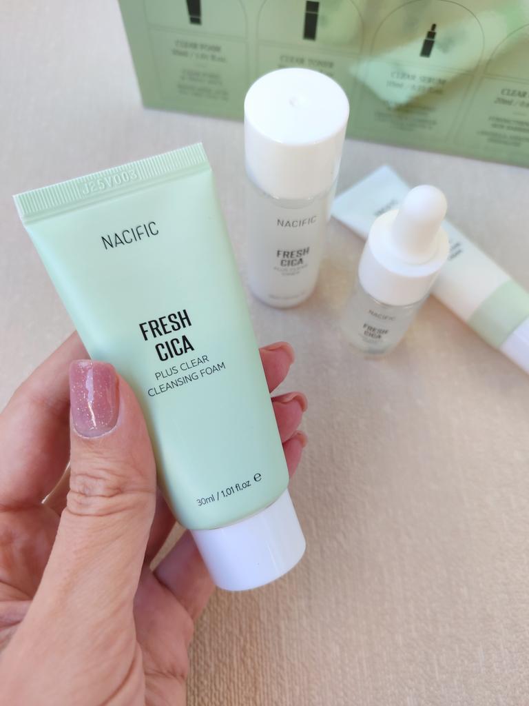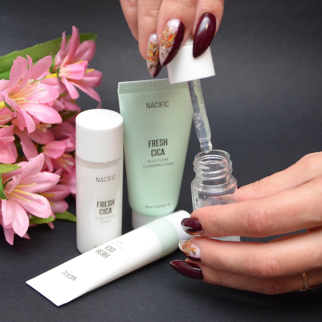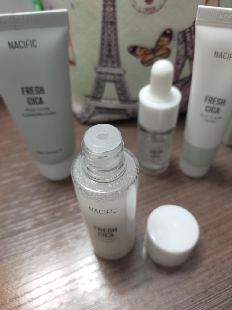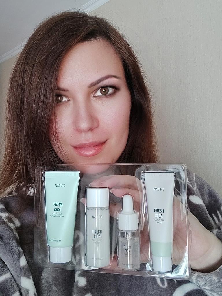 Мини-набор для ухода за проблемной кожей лица от корейского бренда Nacific от которого я в восторге! Доставка в Киев заняла три недели, набор надёжно упакован в фирменную почтовую коробку и пупырку. Сроки годности средств до 2025 года. В набор Nacific Fresh Cica входит: 1. Пенка для умывания 30 мл. Шикарно и мягко очищает кожу, не пересушивая. Хорошо пенится и отлично очищает, при этом оказывает увлажняющий эффект, без чувства стянутости и сухости. 2. Тоник 30 мл. Нормализует уровень ph, оказывает интенсивное питающее и увлажняющее действие. Тоник содержит микрочастицы, как пудра, перед применением нужно взболтать. 2. Сыворотка 10 мл. Сыворотка прекрасно борется с акне, угрями и комедонами, устраняет пигментные пятна и покраснения, а также разглаживает мелкие морщинки. 3. Крем 20 мл. Крем мягко осветляет кожу, активно смягчает и выравнивает рельеф эпидермиса, разглаживая морщинки и неровности, питает и увлажняет. Способ применение: очистить кожу лица с помощью пенки, затем нанести средства в последовательности тоник - сыворотка - крем. Эффект от использования потрясающий! Во-первых, этот набор действительно идеально подходит для проблемной, жирной и комбинированной кожи, как у меня! Во-вторых, эффект от использования шикарный: никакой жирности, даже Т-зона не жирнится в течении дня, при этом, кожа не пересушивается, а именно гладенькая и увлажнённая. Дополняю обзор спустя месяц использования. Ушли чёрные точки, уменьшились поры, прям салонный wow-эффект! Аромат невероятный, такой приятный и свежий, как смесь трав и цитруса. Ни одно средство не оказывало такого крутого эффекта, как этот набор: гладенькая кожа, разглаженная и увлажненная, даже цвет кожи стал ровнее, мне прям очень понравился этот набор! Теперь никаких проблем с декоративной косметикой, она ровно ложится и в течении дня не превращается в жирный блин. Очень понравилась эта миниатюра Nacific Fresh Cica, мне хватит набора на несколько месяцев ежедневного использования, обязательно закажу себе в полном формате. И отдельно хочу сказать о бренде Nacific, пользуюсь уже давно, пробовала разные линейки, каждая хороша по-своему и разработана под определенный тип кожи. Nacific - это лучшая косметика, которую я пробовала, кожа, как после визита к косметологу, я обожаю их косметику и всегда буду искренне рекомендовать!