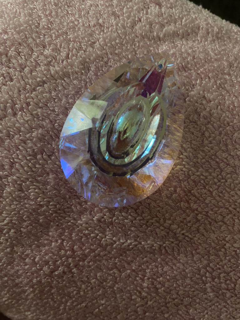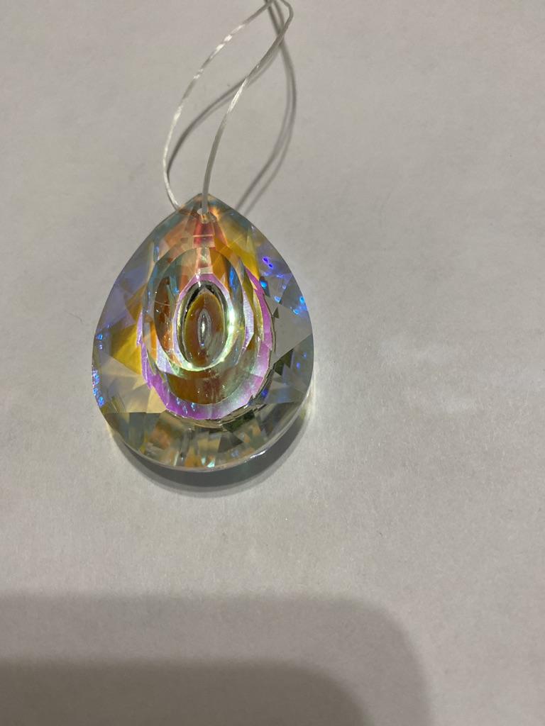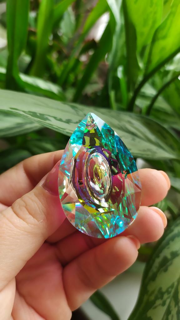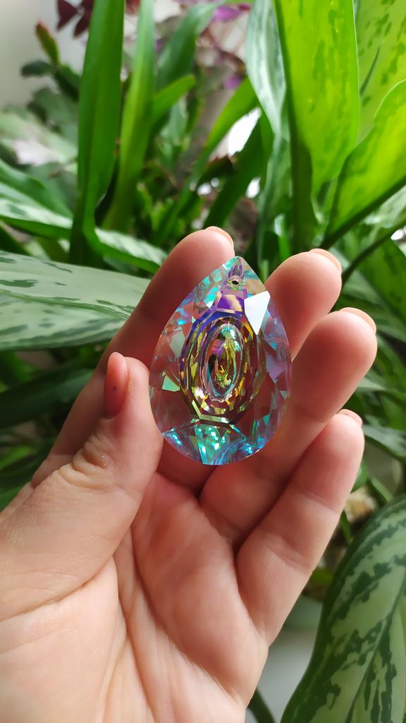 Стеклянная граненая капля. Красивый элемент декора будет переливаться на солнце, ловить его лучики и радовать обитателей дома яркими бликами! Для крепления в вершине кристалла есть отверстие для верёвочки. Размер точно такой как и заявлено 76 мм*52 мм. Кристалл выполнен из стекла и огранён. На одну из сторон нанесена зеркальная плёнка. Проходя через кристалл лучи солнца затейливо играют на стенах и мебели. Свой кристалл я подвесила у окна, так больше шансов поймать скудной Петербургское солнце. ⭐ Продавец упаковал товар в почтовый конверт с пупыркой внутри. ⭐ Трек номер отслеживался до почтового отделения. ⭐ В приложении пришло уведомление о готовности к выдаче заказа. ⭐ Доставка в Петербург заняла 29 дней.