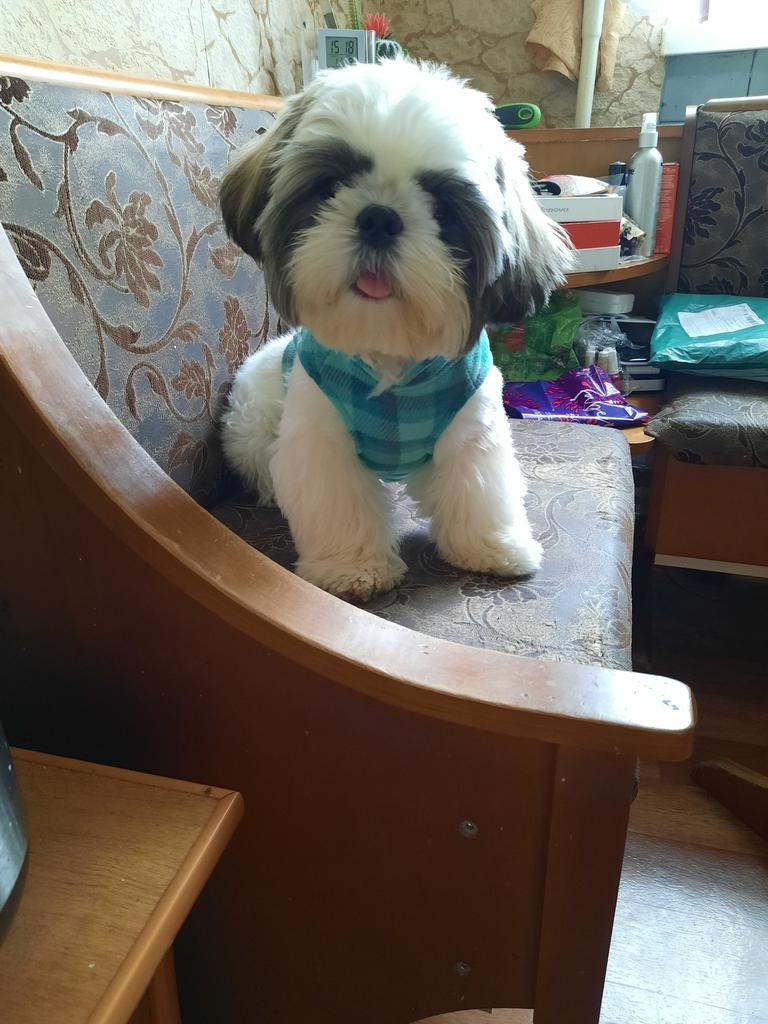 Цвет не такой яркий как заявлено на фото, а так рубашечка очень хорошая, материал мягкий, без запаха, нитки не торчат. Ши тцу 6 месяцев 3 кг