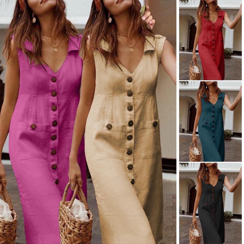 Женское летнее хлопково-льняное платье, однотонное, с v-образным вырезом, без рукавов, с карманом на пуговицах, повседневное винтажное платье