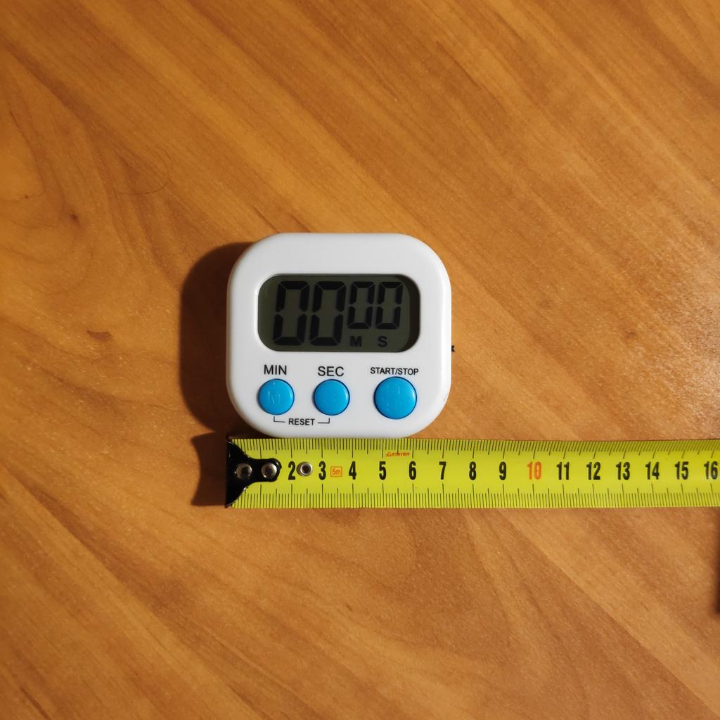 Товар соответствует заявленным характеристикам: - крупные цифры на дисплее; - громкий звуковой сигнал, продолжительность сигнала 30 секунд; - переключатель on/of (автоматического отключения питания нет); - есть крепление магнит; - управление проще некуда; - размеры 70-65-20 мм. Большое спасибо! Товаром доволен - то что надо! Доставка заняла две с половиной недели, продавца рекомендую.