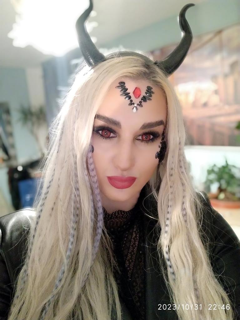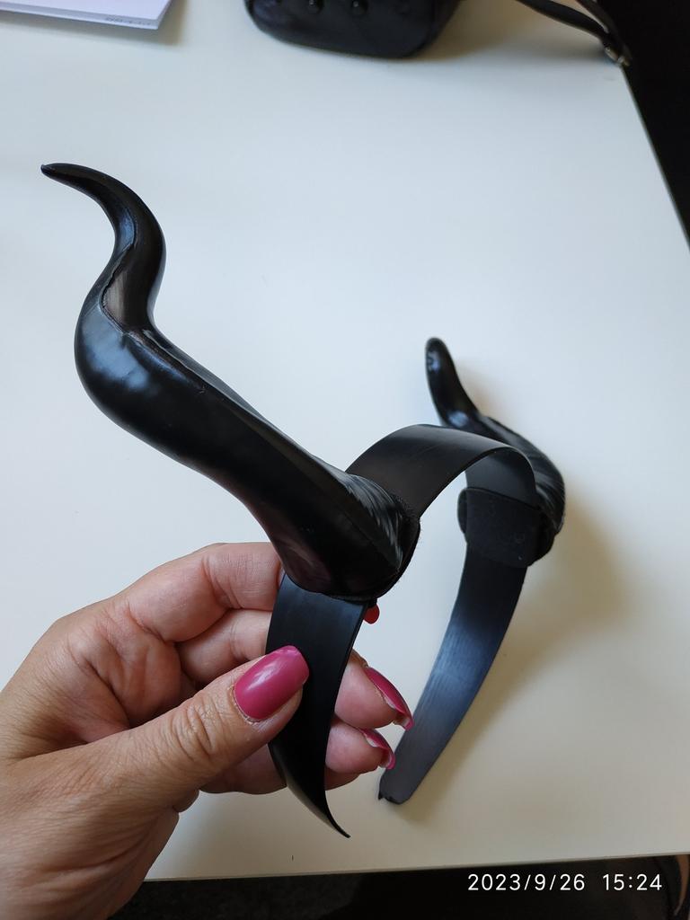 Рожки отдельно от обруча. Так как обруч широкий, то при одевании на него рогов - дермантиновое крепление распоролось. Хорошо, что оторвался рог, когда шла уже с Хеллоуина домой. Поправила и он отвалился(( Буду клеить