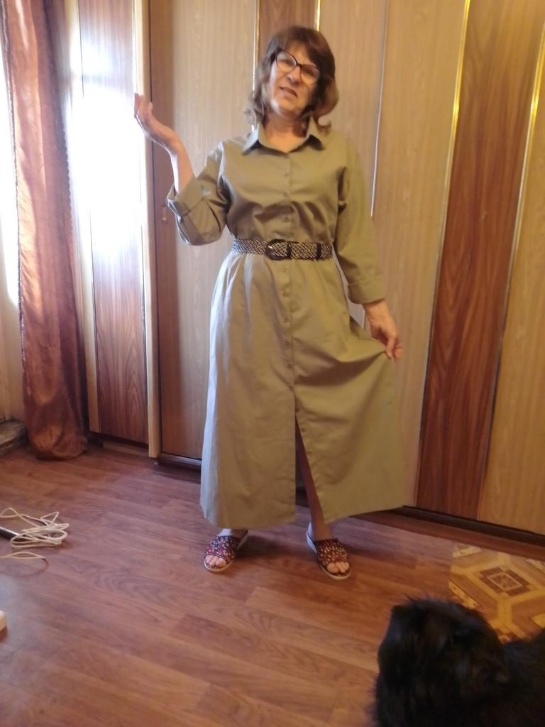 Отличное платье. Материал тонкий, лёгкий, х/б, гладить влажным или через мокрую ткань, размер подошёл идеально , ношу 52/165. Пуговички спереди, застёжка, до середины икры, длина юбки до пяток , мне нравится, село идеально, рукава длинные, прямые, без манжет, при желании можно закатать, два кармана в боковых швах. Цвет намного светлее, чем на фото оригинала, не хаки , а скорее светло-серо-зеленый с молоком, но приятный, летний. Силуэт прямой, немного широковато, но с широким ремешком или подходящим по стилю поясом , просто замечательно. Именно такое платье и хотела, стиль спортивная классика-миллитари. Очень понравилось, советую.Фото с разными поясами.