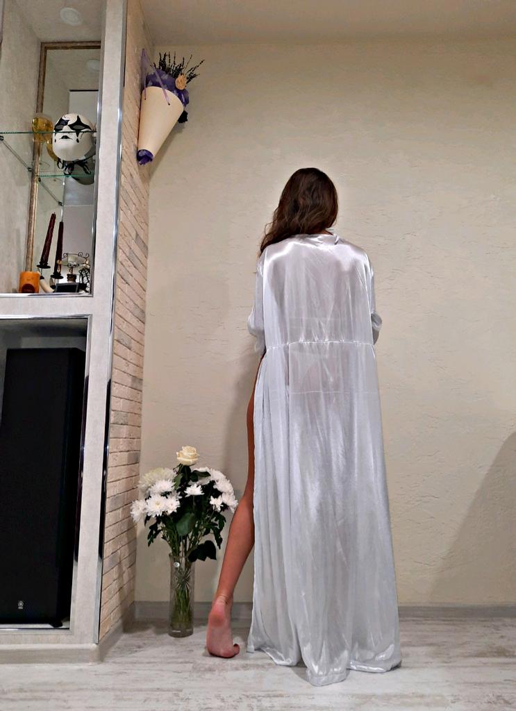 Мои параметры ОГ 90, ОТ 74, ОБ 96. Взяла размер 2XL. Подошёл хорошо. Запахивается несильно. Думаю, задуман, как накидка. Может, пришью завязки, чтобы не приходилось постоянно поправлять. Смотрится красиво. Материал, как на сорочке, полупрозрачный, растяжимый. Носить приемлемо перед сном, после сна, пока пью кофе или прихорашиваюсь в своей спальне. Также, хорош, если днём прилегла отдохнуть. Чувствуешь себя красоткой. Не понравился пояс– атласная лента, которая оставляет затяжки на материале острыми краями. Хотела купить ещё в чёрном цвете, но думаю, на чёрном затяжки будут заметнее. Кое-где в шве торчит кусочек материала и нитки у кружева (незначительно, легко отстричь). Доставка до г. Костромы 7 недель.
