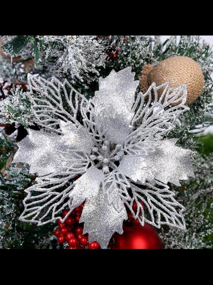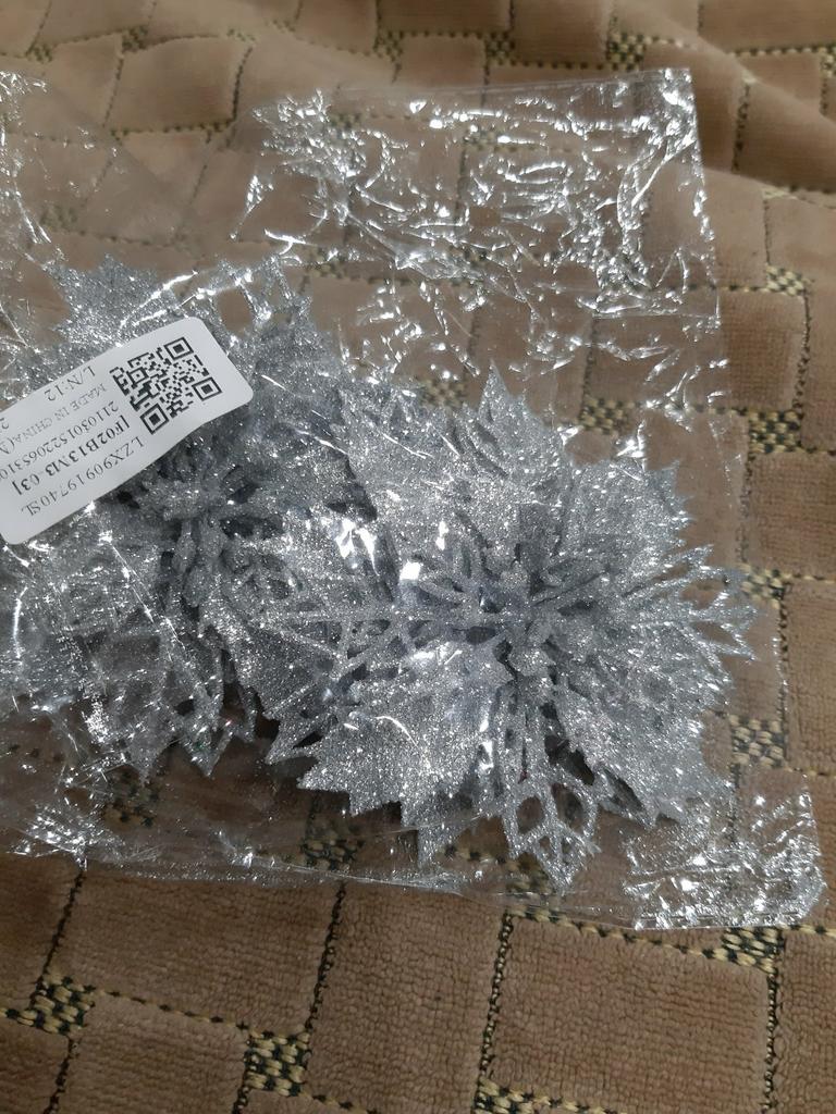 Рождественское украшение на ёлку в виде цветов. 🌸 Заказала две упаковки по 5 штук, серебристого цвета. Промофото и описанию соответствуют. Смотрятся супер! 🥰👌 Сначало расстроилась, что нет крепежа, заказала отдельно крокодильчики, но ножки цветов в дырочки зажимчиков не подошли..печаль одалевала..😔 Когда же пришло время наряжать ёлку, разложила их просто на ветви и о чудо! Они вписались просто фантастично! 😃👍 Лежат хорошо, не падают, красиво поблёскивают, правда чуток сыпятся, ну так праздник же! Должно всё сверкать..💯 Я покупкой довольна, рекомендую однозначно! К тому же есть разные цвета на выбор. ☝️🙄 ✈️ Доставка в Беларусь чуть больше месяца. 🧐 Трек номер отслеживался до почты. Спасибо продавцу и Джуму! 🤗❤️ Всем только приятных покупочек и быстрых доставочек! 🛍️ С Наступающим Новым годом и Рождеством Христовым! 🎄🎅🎁
