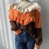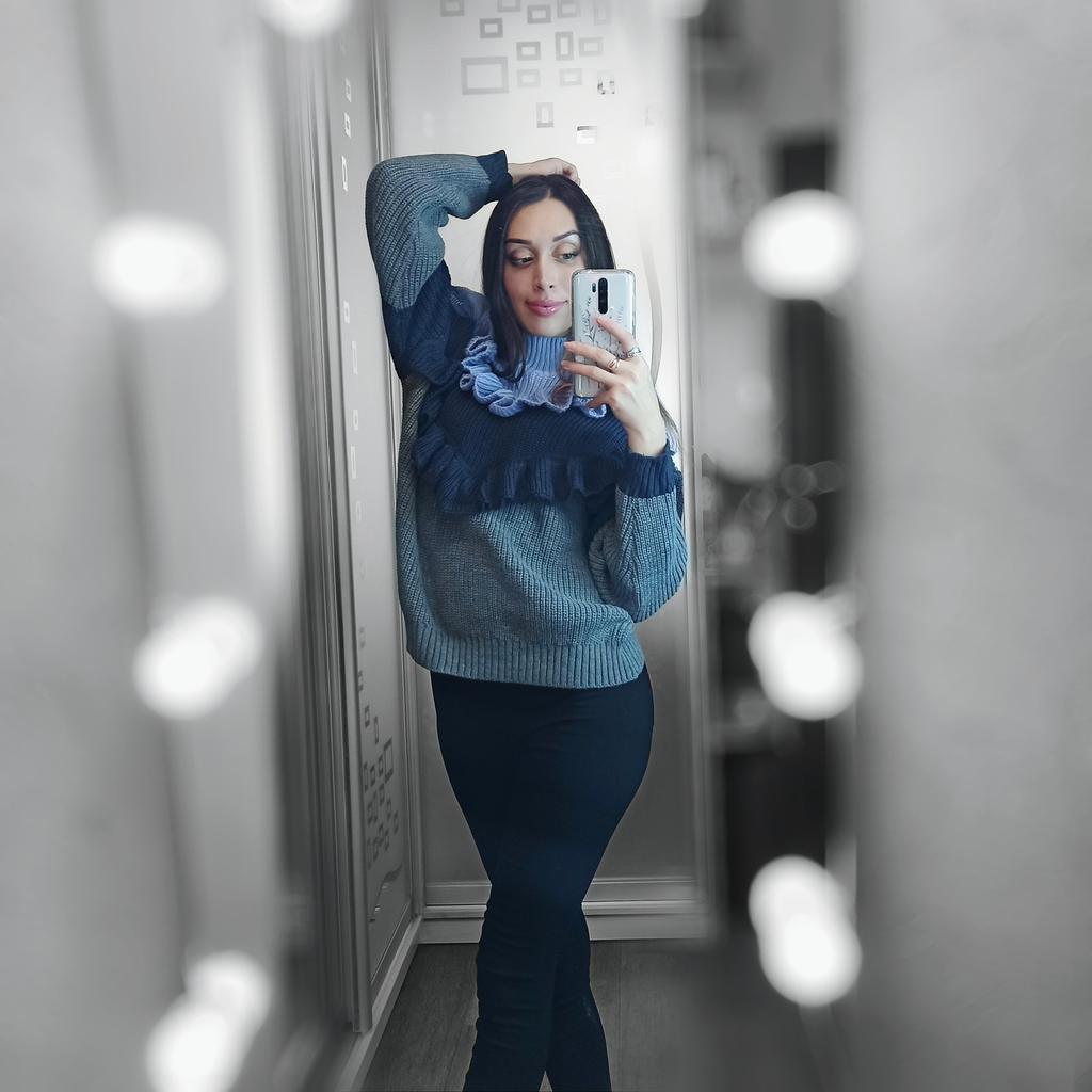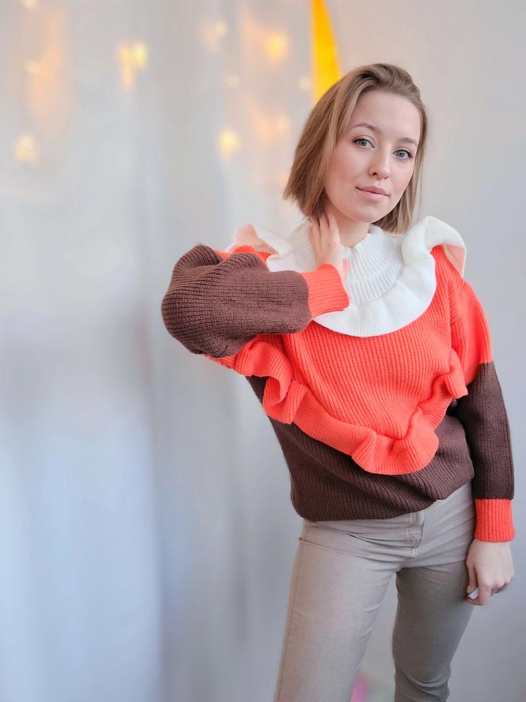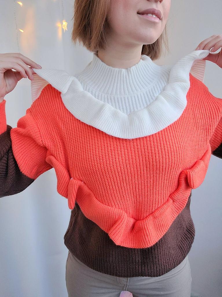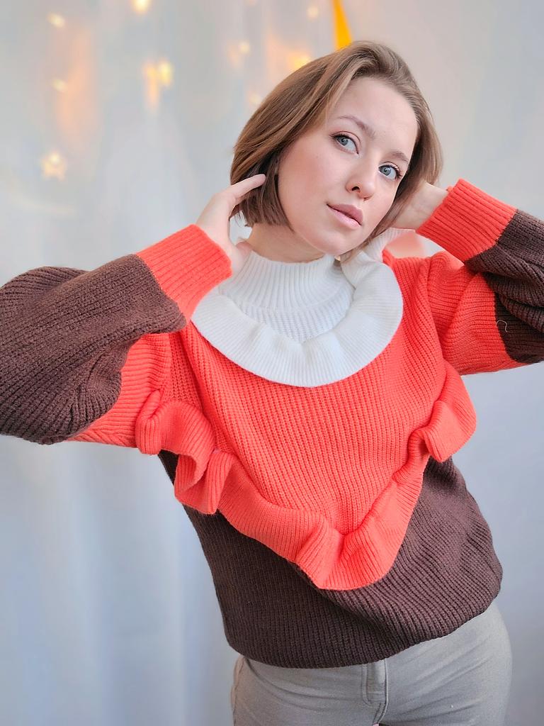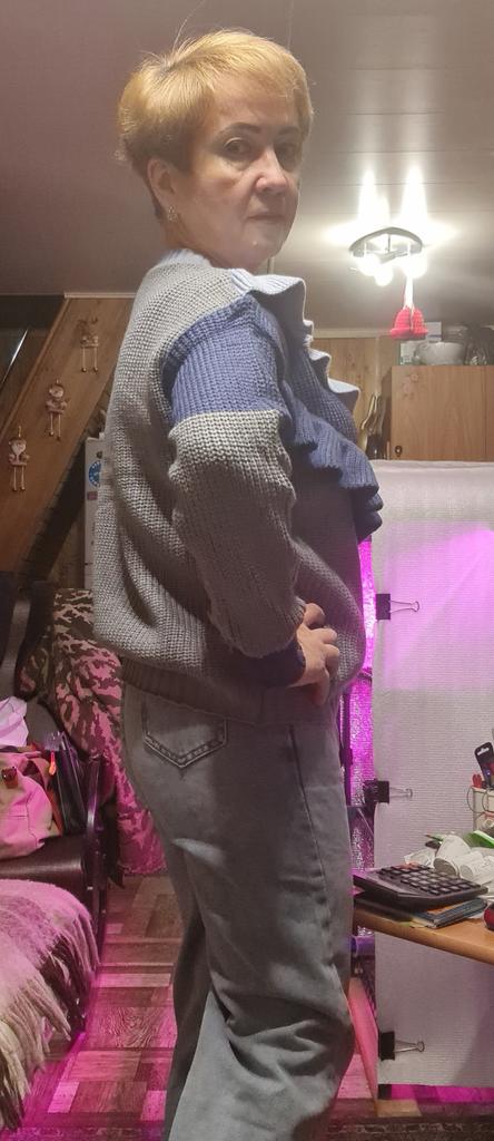 Очень крутой свитер в который я влюбилась. Без преувеличения. Свитер бомба. Смотрится просто вау. Вязка плотная, объемная. Я боялась что будет нелепо выглядеть на мне вся окантовка в виде рюш, но в итоге я не пожалела о своем выборе. Цвет у свитера так же очень эффектный . Свитерок идёт в стиле оверсайз. Так свитер выглядит на моих параметрах ог83-от64-об93. Есть приличный запас. Подойдёт на 42-44-46 Слегка тянется. Рукавички как раз. В свитере не жарко, в нем очень уютно и комфортно. Акрил мягкий и приятный. Из минусов это запах нитей пыльный. В остальном рекомендую , таскаю свитер со дня покупки👍