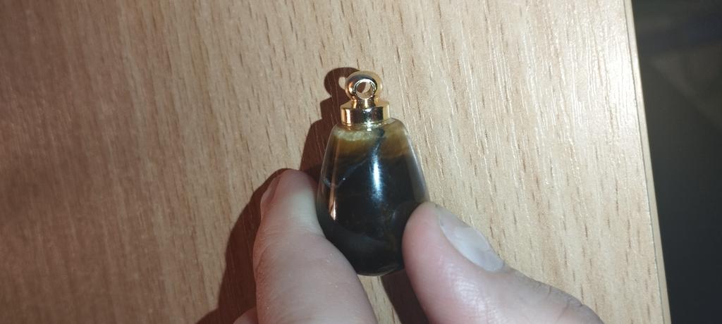 Хорошего качества кулон, тяжеленький, думаю камень. Надо колечко чтоб одеть на цепочку. Можно духи залить или масла, откручивается, резьба.