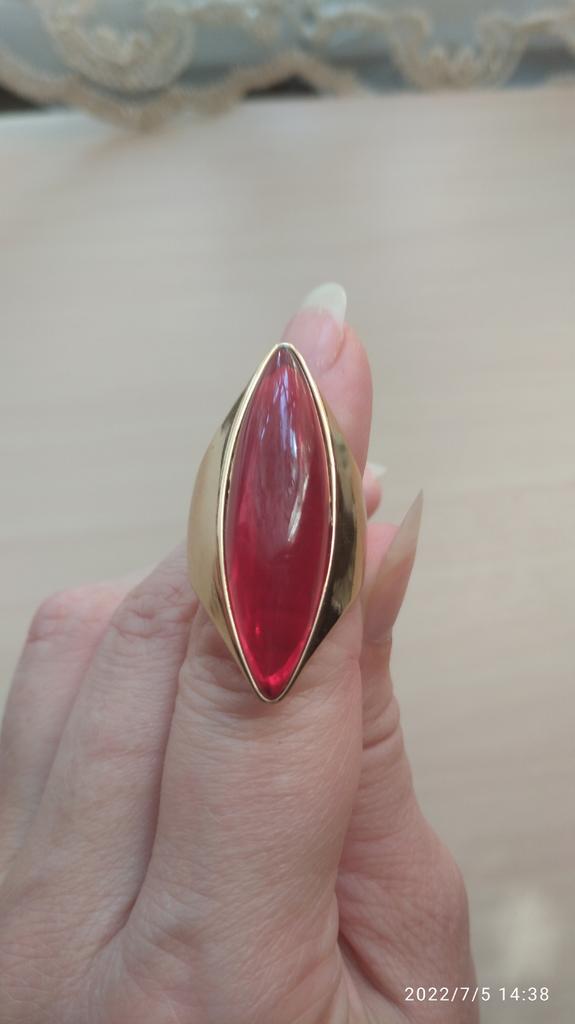 Очень красивое кольцо в достойном качестве, что бывает редко на джуме. Камешек (пластик или эпоксидка) очень аккуратно поставлен, клей нигде не торчит, на ручке смотрится красиво. Кольцо крупной формы "маркизка", для любителей подобной формы колец. Будет хорошо смотреться только на тонких пальчиках. Сколько продержится золотое покрытие я не знаю, но за свои деньги, колечко просто 🔥