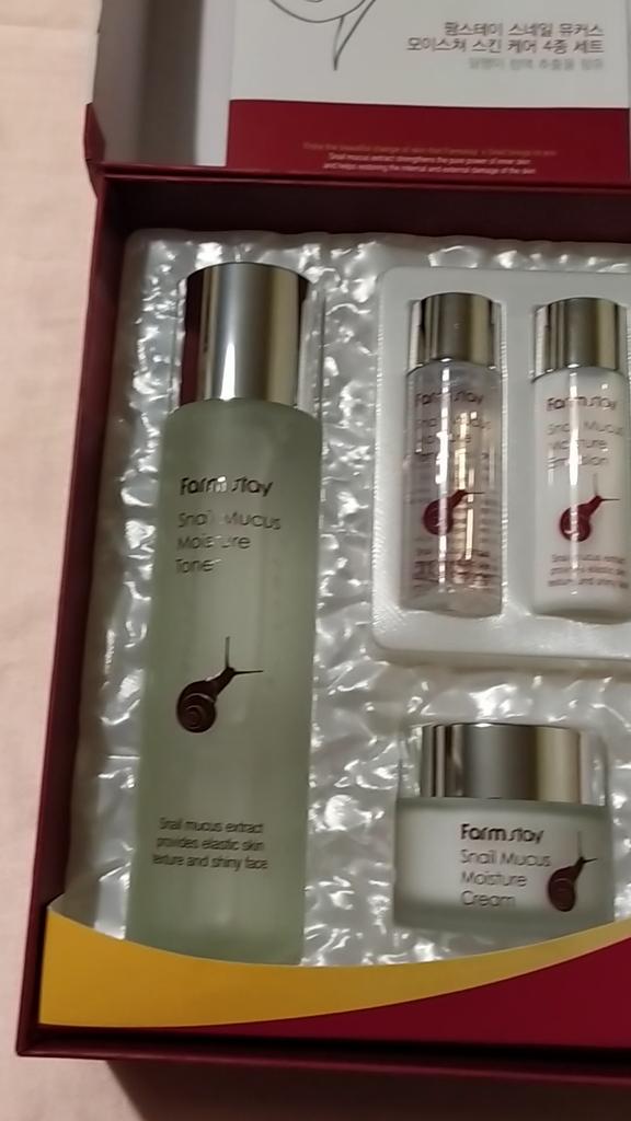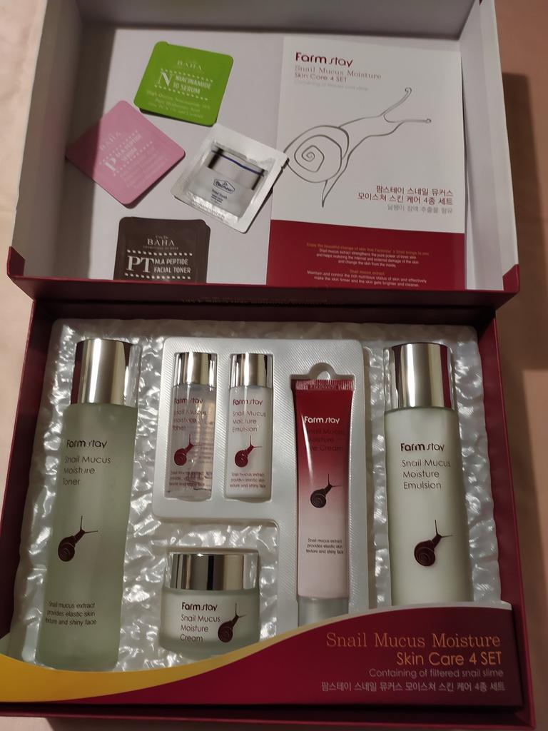 Информация от производителя. Великолепные ухаживающие свойства всех средств из набора обеспечивает содержащийся в их формуле экстракт улитки. Подходят для любого типа кожи. Основной активный компонент экстракта улитки – муцин, сложный белок с уникальными целебными и косметическими свойствами. Он способен воздействовать на глубокие слои кожи, стимулирует активность фибропластов, усиливая тем самым синтез коллагена и эластина, борется с различными воспалениями, акне, минимизирует действие свободных радикалов. Все средства линии Snail Mucus Moisture хорошо увлажняют, смягчают, защищают кожу от УФ-излучения и предотвращают старение. При регулярном применении средств кожа становится более упругой и гладкой, уменьшается количество морщин и их глубина, происходит осветление пигментации. В набор входит: тонер 150 мл + эмульсия 150 мл + крем 50 гр. + крем для глаз 40 гр. + тонер 30 мл + эмульсия 30 мл. Способ применения: последовательно использовать тонер, эмульсию или крем, крем для кожи вокруг глаз. Шикарный набор! 🔥👍Продавец просто МОЛОДЕЦ ❤️ ,упаковал всё очень надёжно, коробочка совсем не пострадала, за что ему огромное спасибо! 💋К тому же положил 3 пробничка, мне было очень приятно!❤️ Будем омолаживаться! Рекомендую и товар, и продавца! 💯❤️Спасибо Джум!❤️