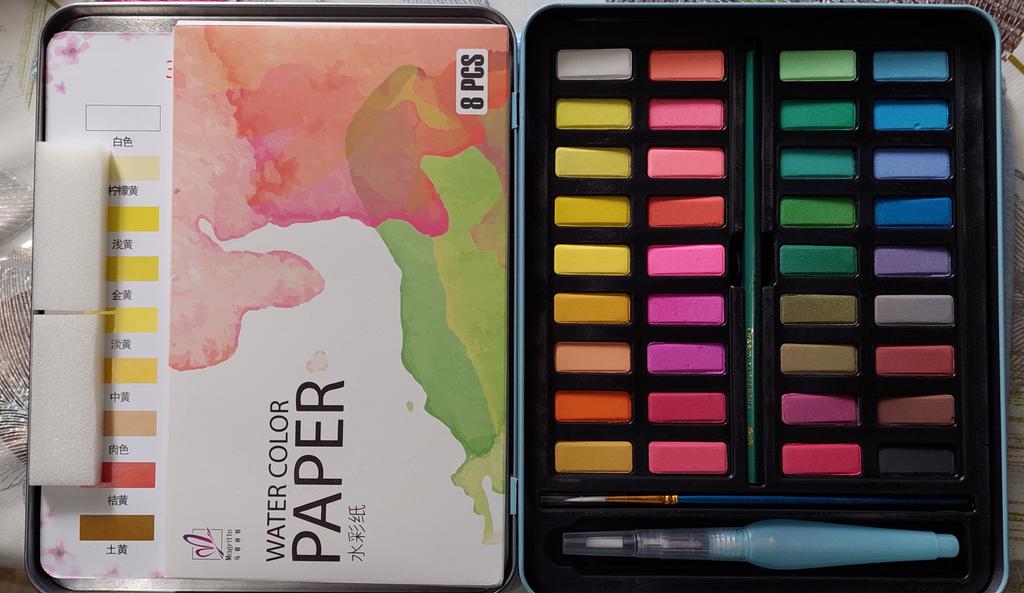 Товар пришел быстро отслеживался частично качество товара отличное смотрится очень шикарно, всё в целости и сохранности,в комплекте краски в металлическом пенале,2 кисти, карандаш, бумага для рисования и симпатичный мешок для хранения пенала. Товар и продавца рекомендую.
