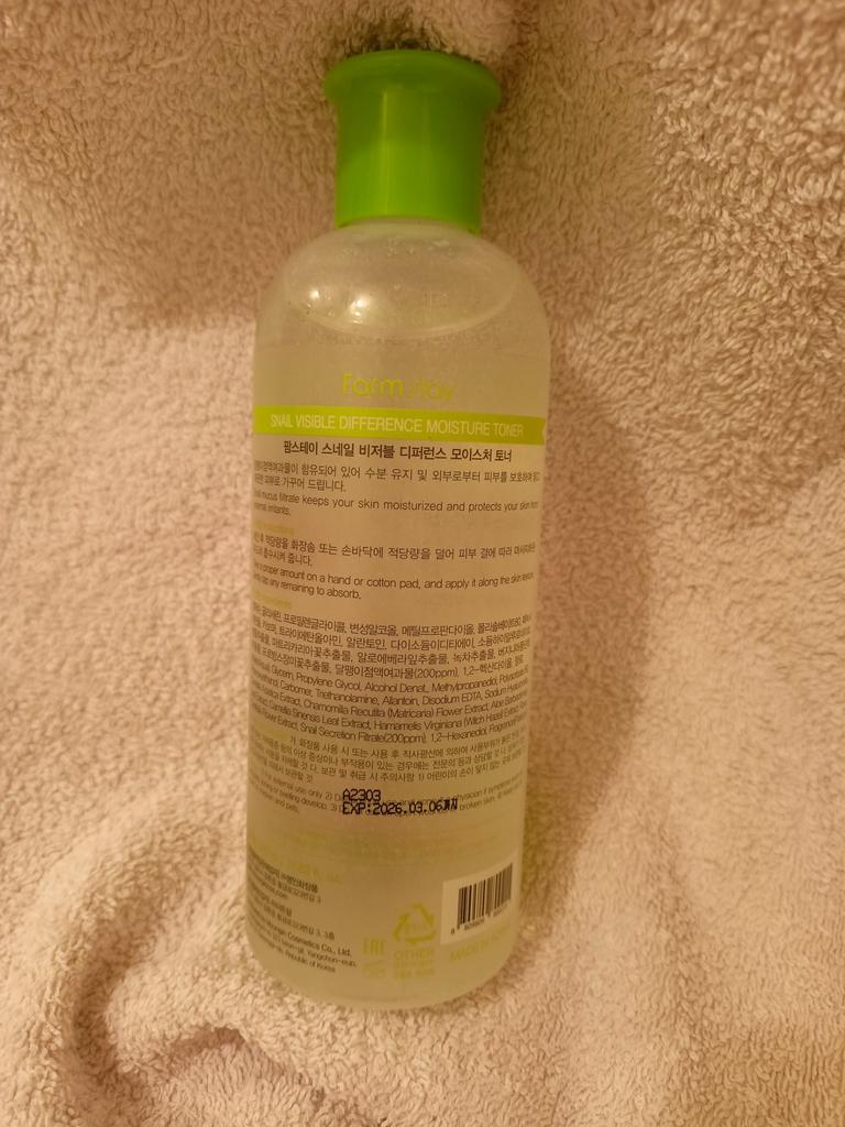 Корейский тонер с муцином улитки. Всё как в описании продавца. Аллергии, раздражения за 2 дня применения не вызвал. Хорошо увлажняет кожу, подготавливает для последующего ухода. Я сначала очищаю кожу лица и шеи с помощью геля или пенки для умывания. Затем наношу тонер с помощью ватного диска на всё лицо, шею и декольте. После этого использую сыворотку, и крем. Или маску для ночного ухода, если вечером. Использую 2 раза в день, утром и вечером. Тонер упакован в пластиковый флакон, объём целых 360! мл (надолго хватит). Крышка винтовая. Флакон с дозатором, что очень удобно, была приклеена мембрана из фольги, чтобы при пересылке ничего не протекло. Срок годности хороший 👍. Рекомендую к покупке 😍