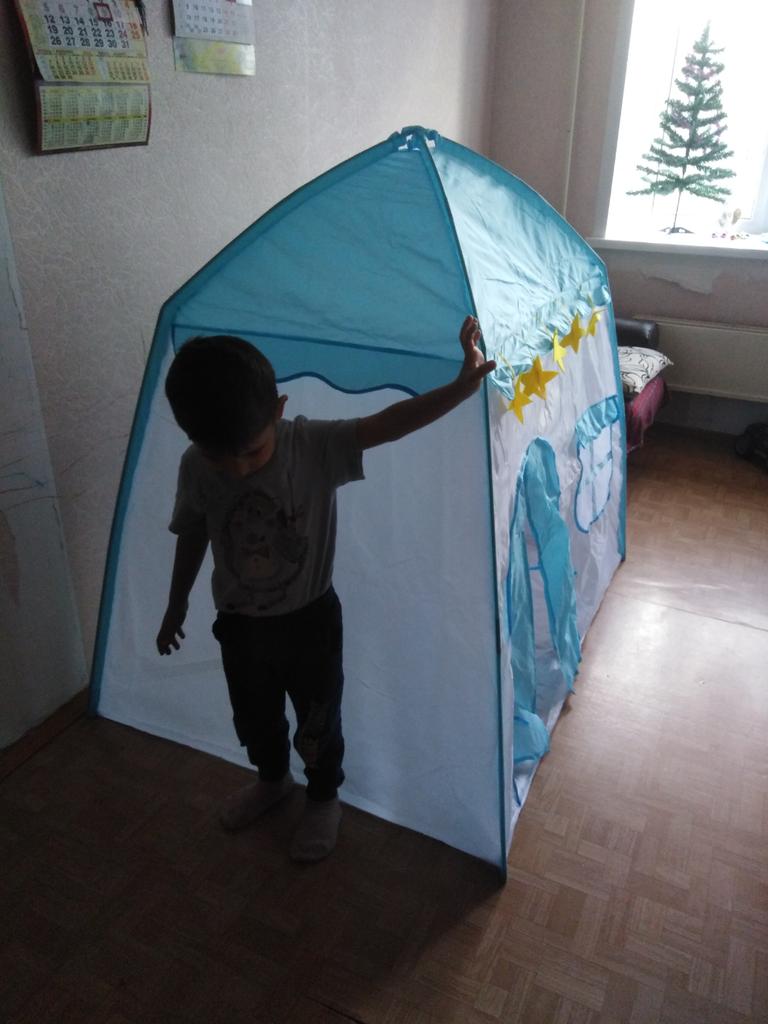 Домик очень понравился. Соответствует картинке, большой, можно вместе с ребенком в него поместиться и место останется. Качественный и без запаха. Доставили быстрей указанного срока. Минус за каркас-если повредить при сборке кончик палки- она крошится на мелкие прозрачные волокна, которые впиваются занозами в руки. Их не видно. У меня не получилось собрать каркас без повреждения. Поэтому делюсь опытом- будьте внимательны и сильны с палками, собирайте без ребенка от греха подальше.