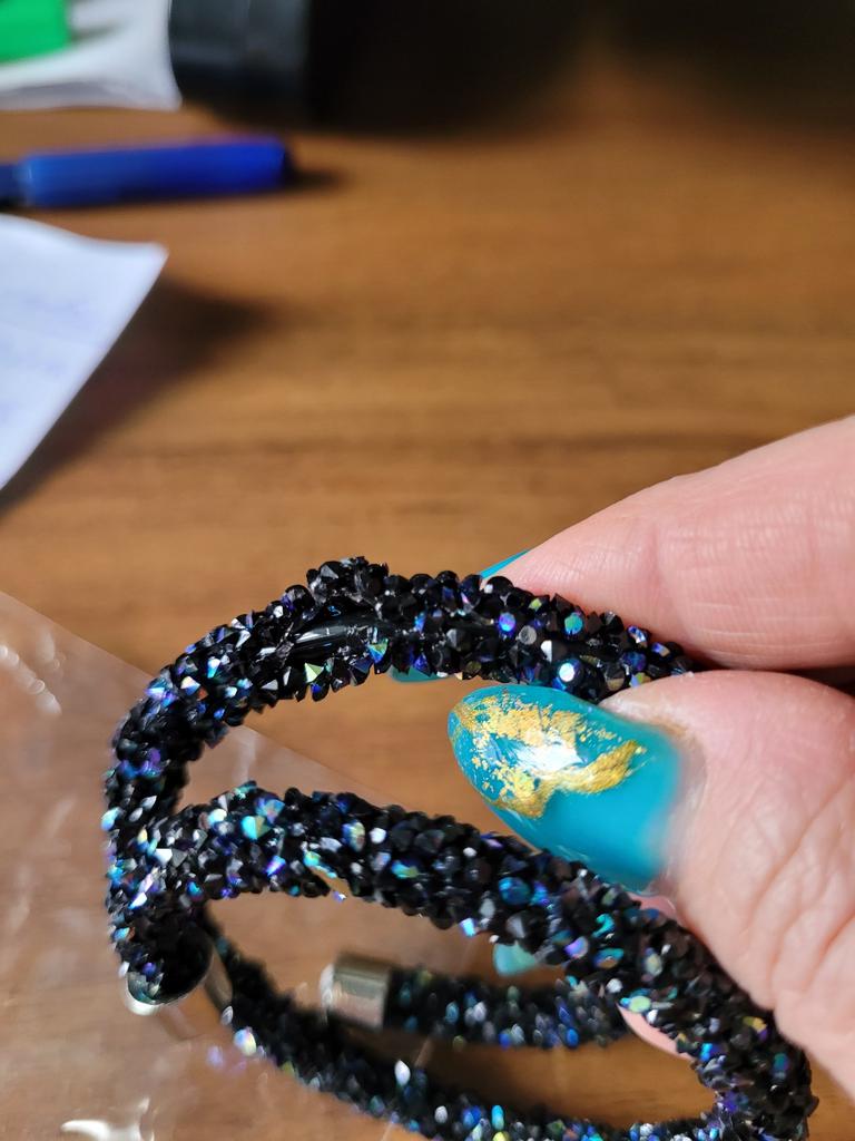 Симпатичный лёгкий браслет, блестит, для лета или как вечерний, на опухшие ручку впритык, но можно обернуть свободен. Подойдет для разного размера руки. При одевании немного блеск сыпятся, но так браслет почти не ощущается на руке, приятный.